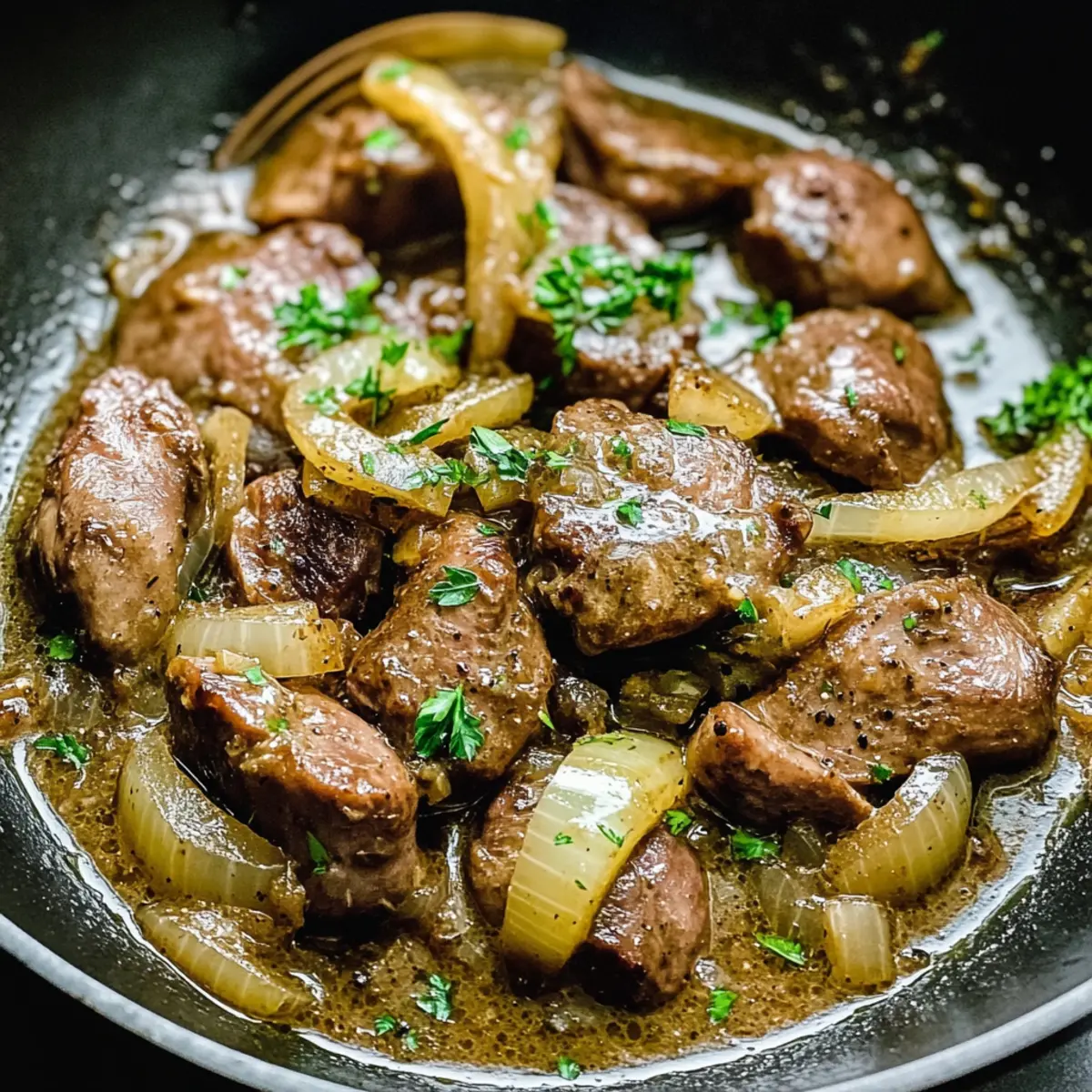 Herzhafte Hühnerleber und Zwiebeln in Sahnesoße