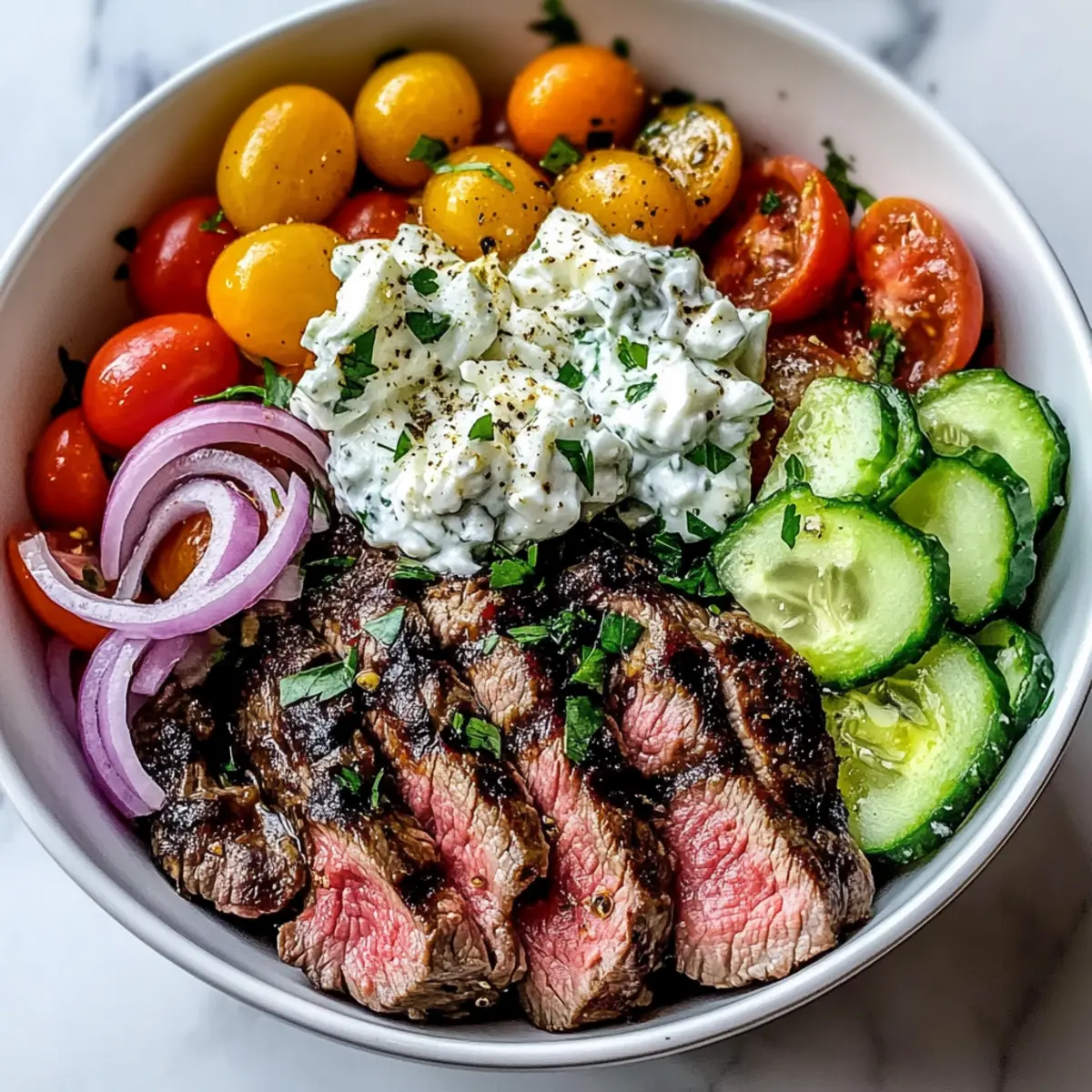 Einfache Mediterrane Steak Schüssel Rezept für jeden Abend