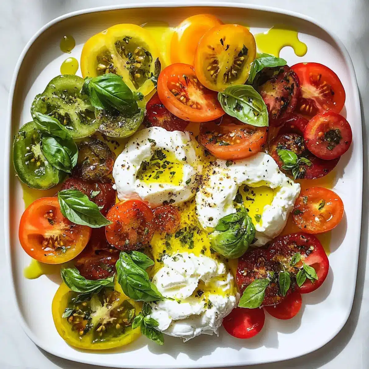 Erbstücktomatensalatplatte mit Burrata und Basilikumöl