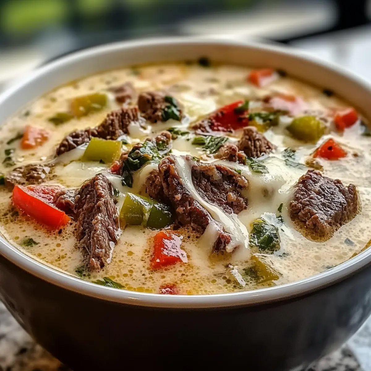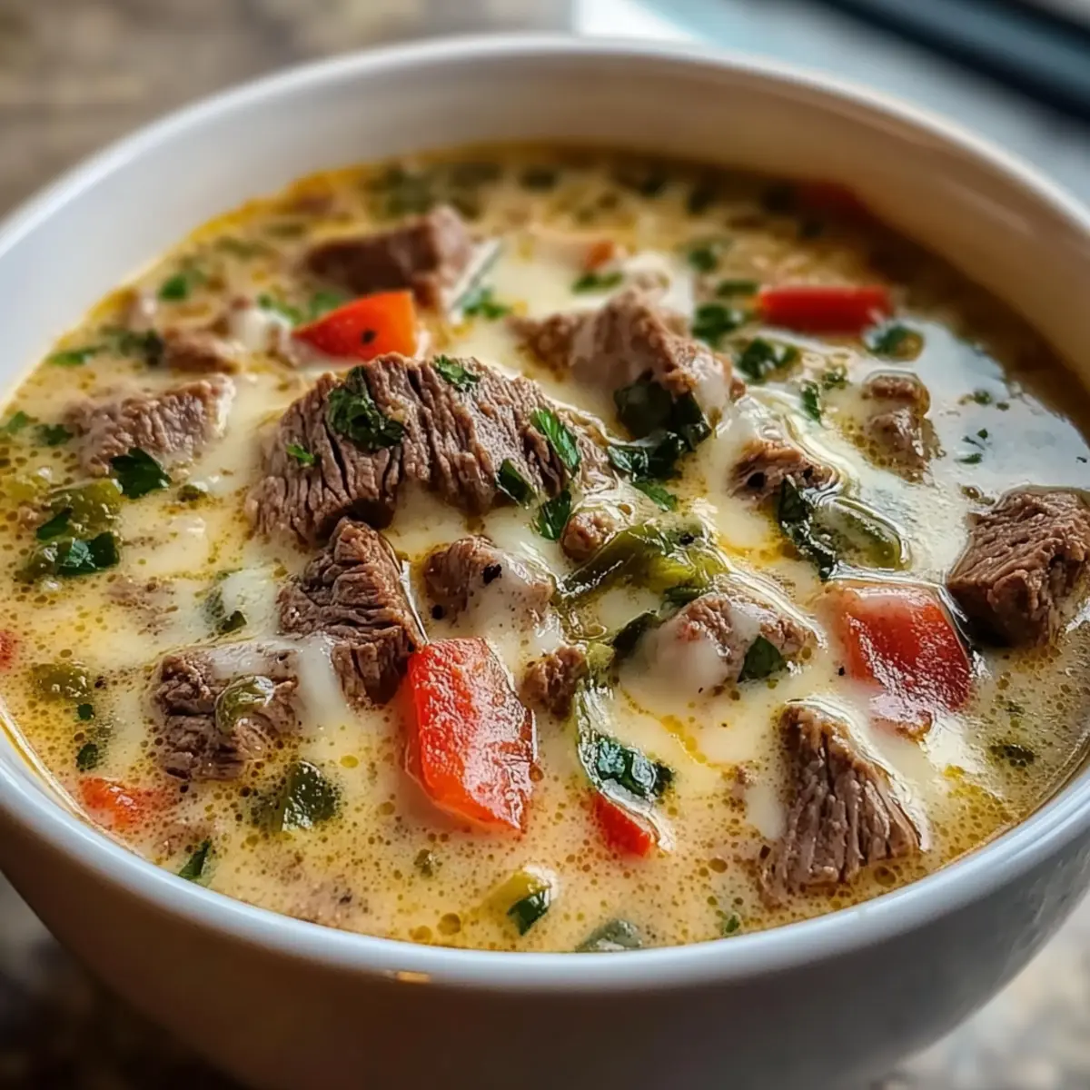 Wärme und Trost: Diese Cremige Philly Cheesesteak Suppe ist die ideale Lösung für kalte Abende, die Seele und Magen gleichermaßen wärmt.