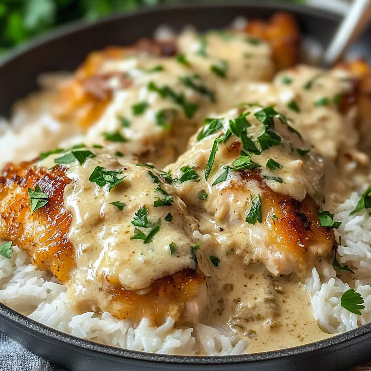 Verteile den gekochten Reis gleichmäßig auf Teller und lege jeweils ein Stück Hähnchen mit der cremigen Sauce darauf. Garniere das Gericht mit 2 Esslöffeln frisch gehackter Petersilie und zusätzlichem Parmesan, wenn gewünscht. Serviere die cremige überbackene Hähnchen und Reis warm und genieße diese herzhafte Mahlzeit!