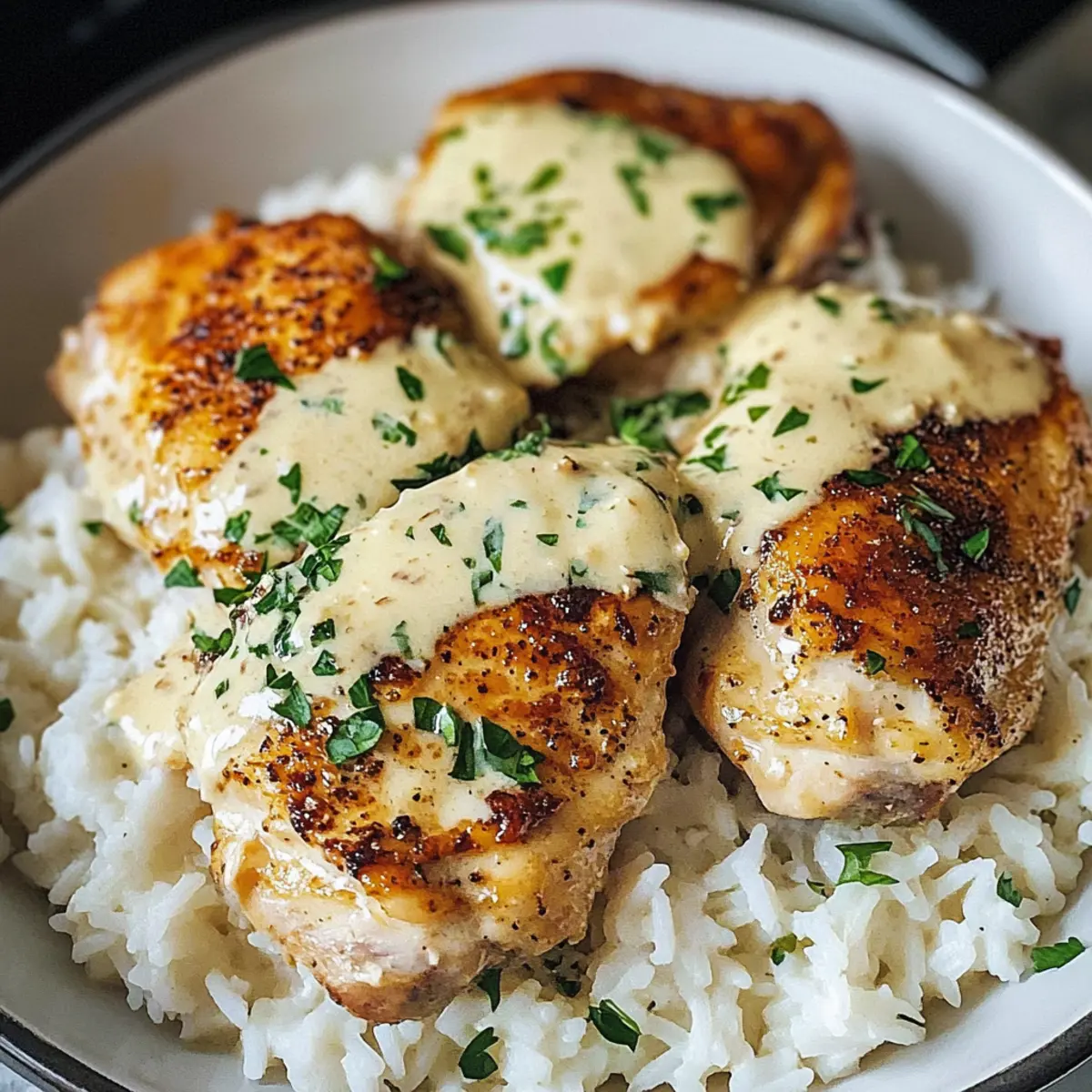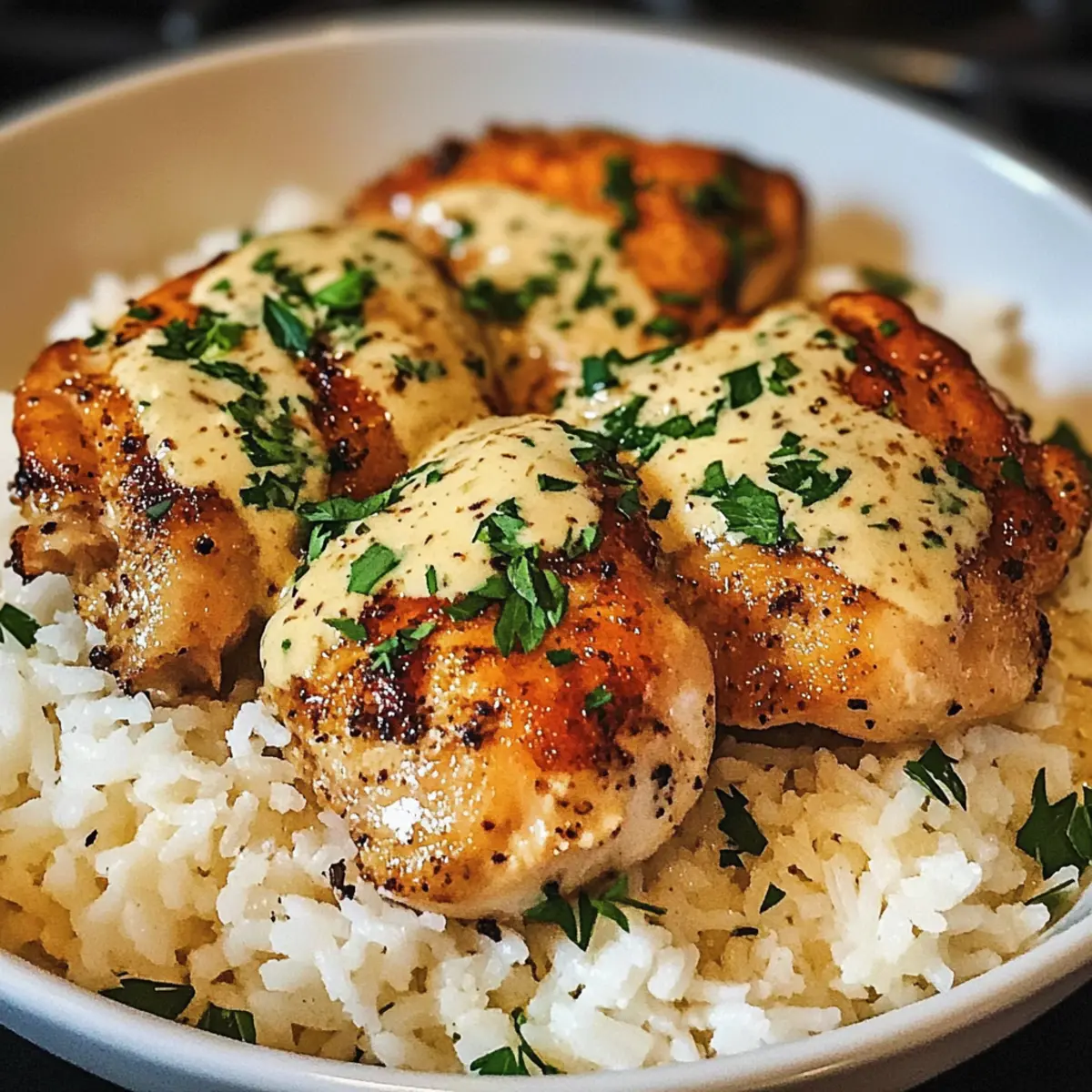 - Anrichten und servieren: Serviere Reis mit Hähnchenkeulen und Sauce, garniere mit Petersilie und Parmesan.