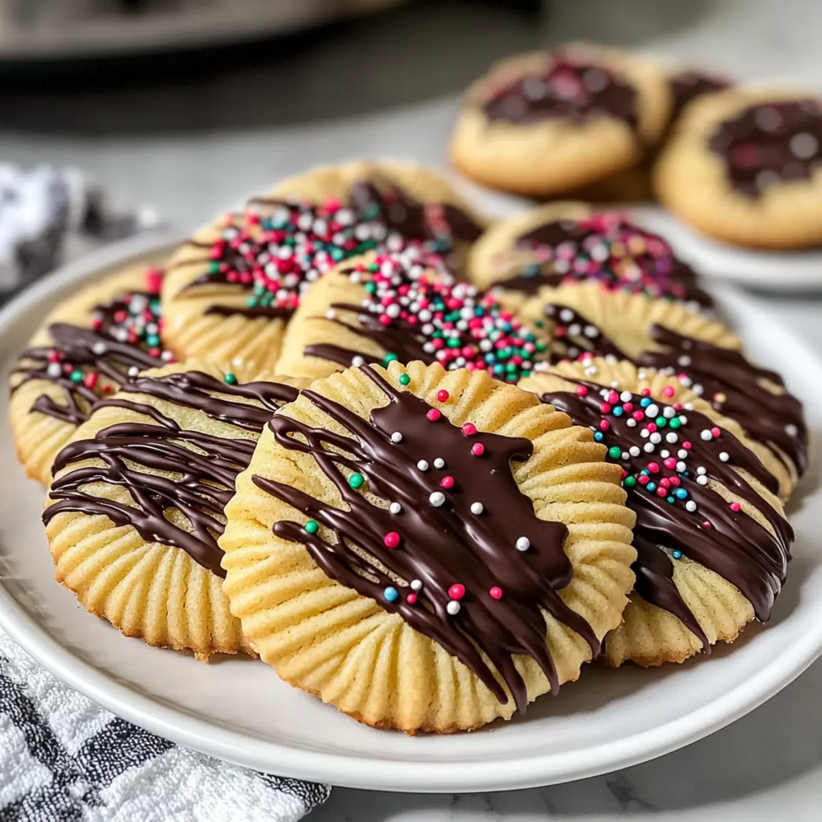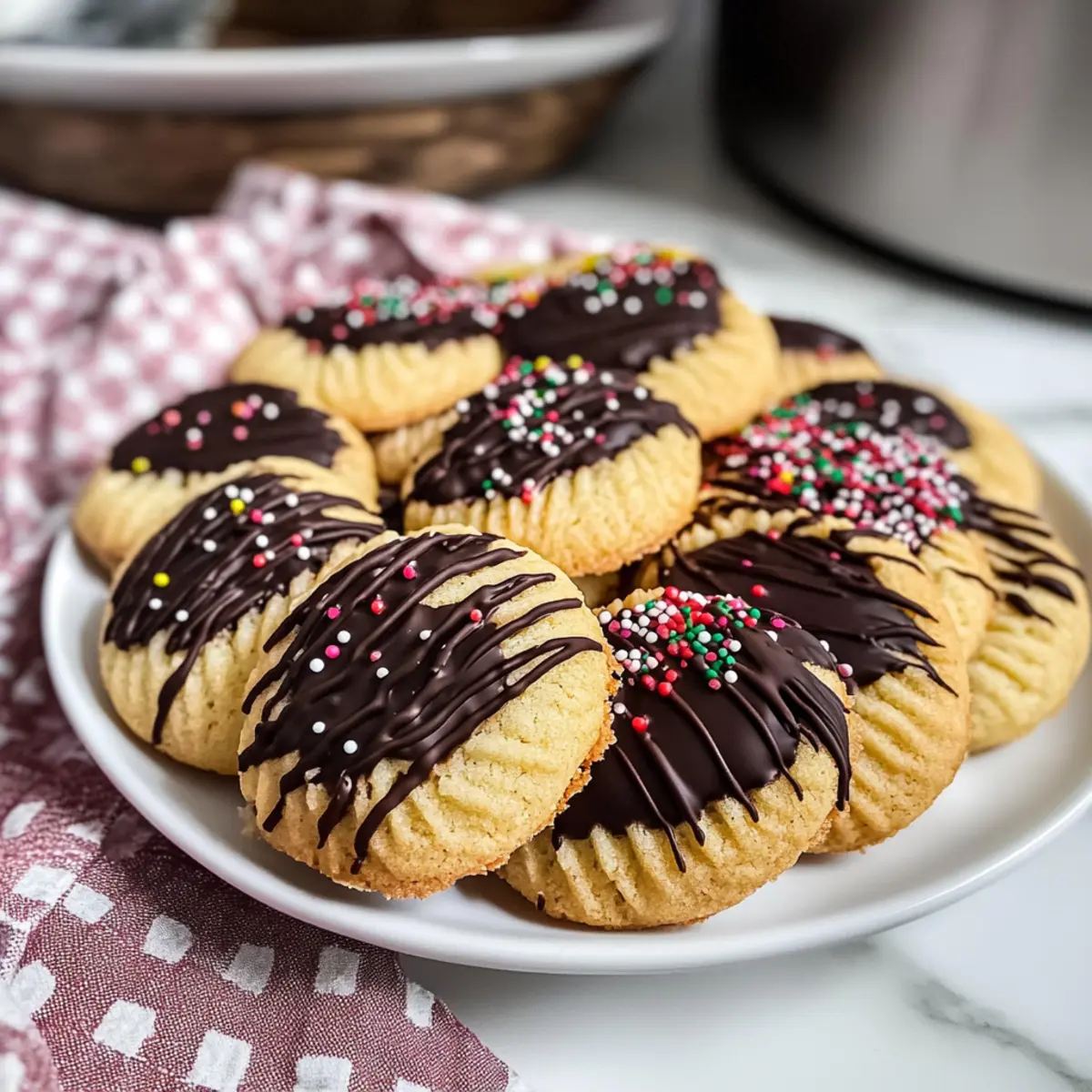 Tauche zwei Drittel jeden abgekühlten Cookies in die geschmolzene Schokolade und lege sie auf Backpapier. Verziere die schokoladigen Plätzchen nach Belieben mit bunten Streuseln und lasse sie vollständig aushärten, bevor du sie servierst.