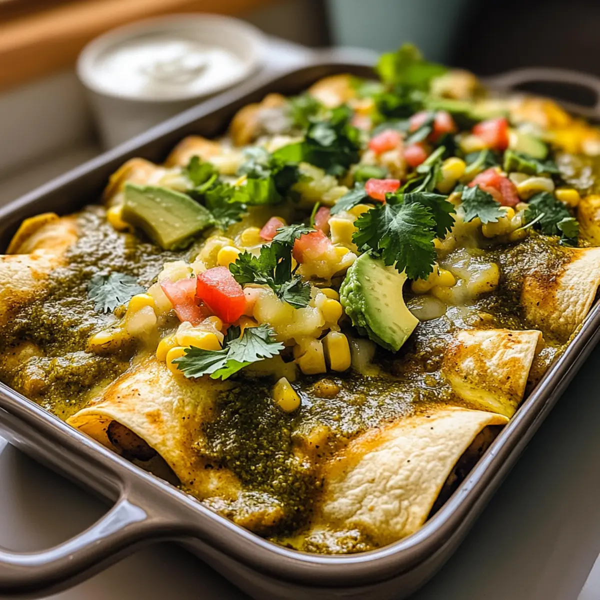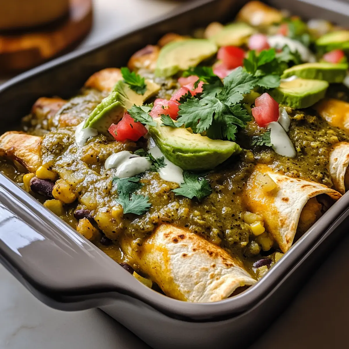 Gieße die verbleibende grüne Chili-Enchiladasoße gleichmäßig über die gerollten Tortillas, um sicherzustellen, dass sie während des Backens sausig und köstlich bleiben. Decke die Auflaufform mit Aluminiumfolie ab, um die Feuchtigkeit einzuschließen und ein Austrocknen der Enchiladas zu verhindern.