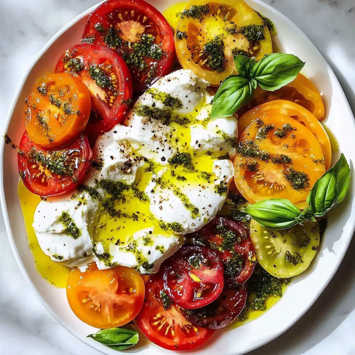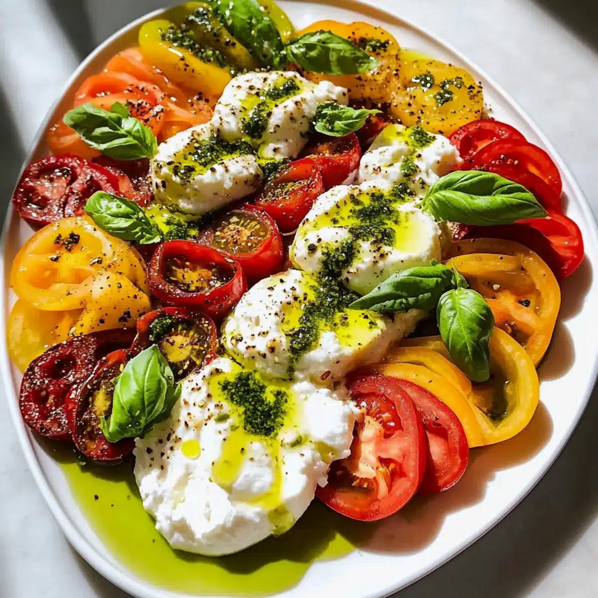 Erbstücktomatensalatplatte mit Burrata und Basilikumöl