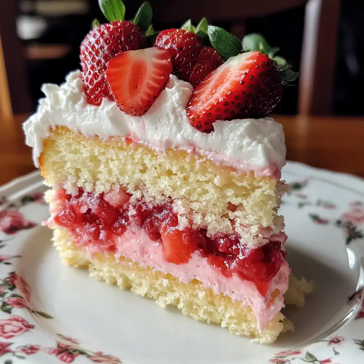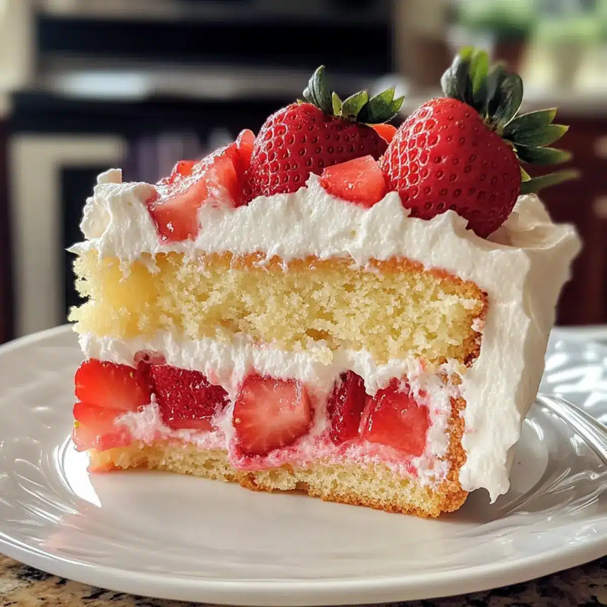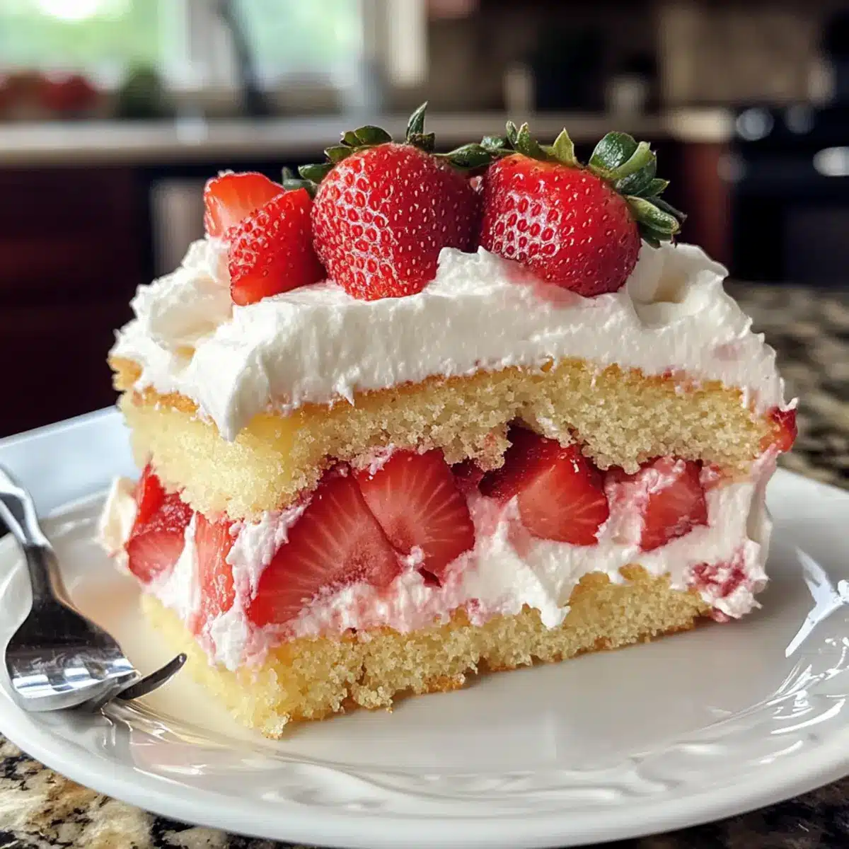 - Vor dem Servieren gleichmäßige Schichten von Schlagsahne auf dem Kuchen verteilen und mit frischen Erdbeeren dekorieren.