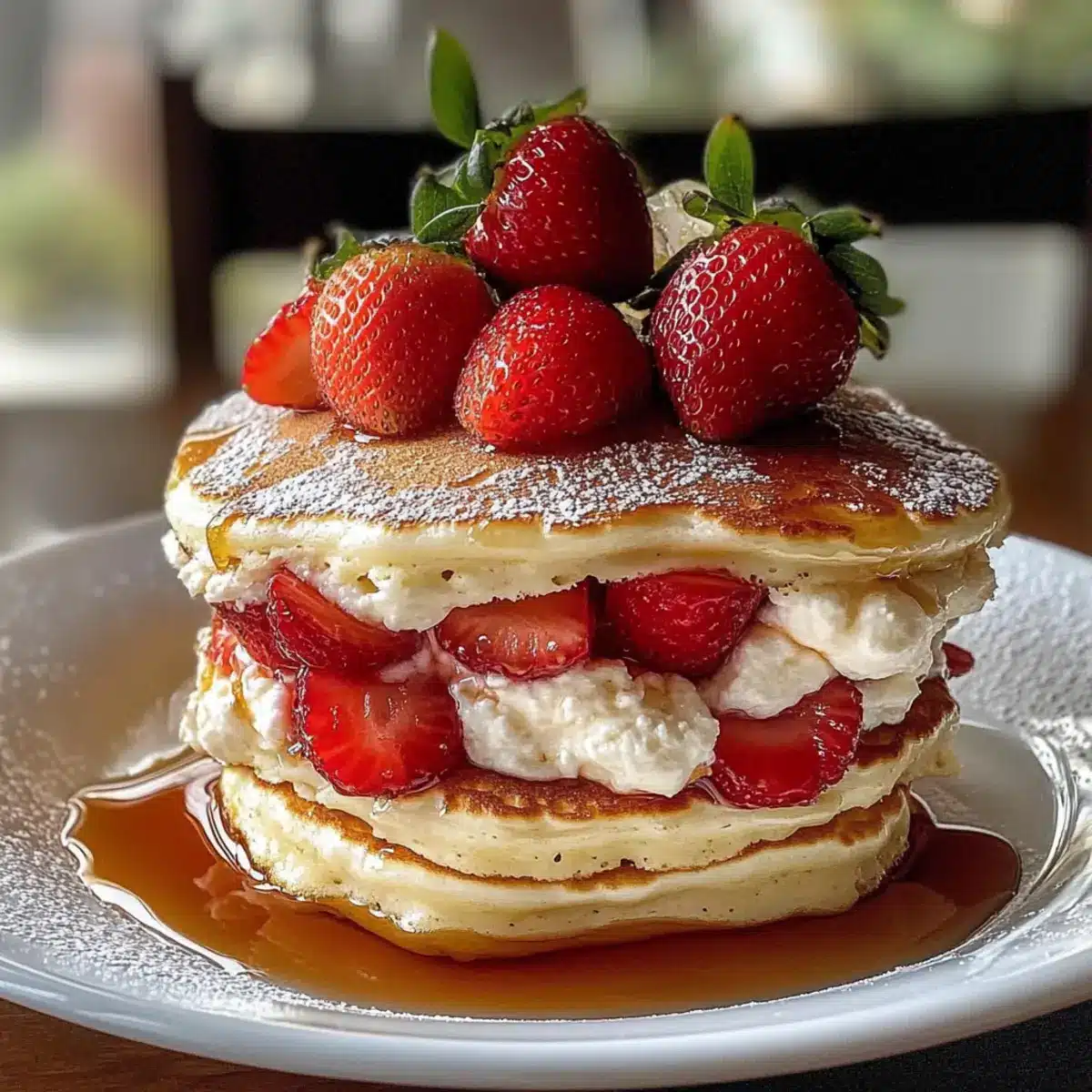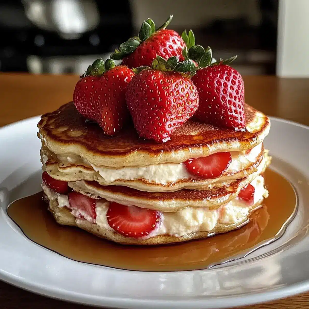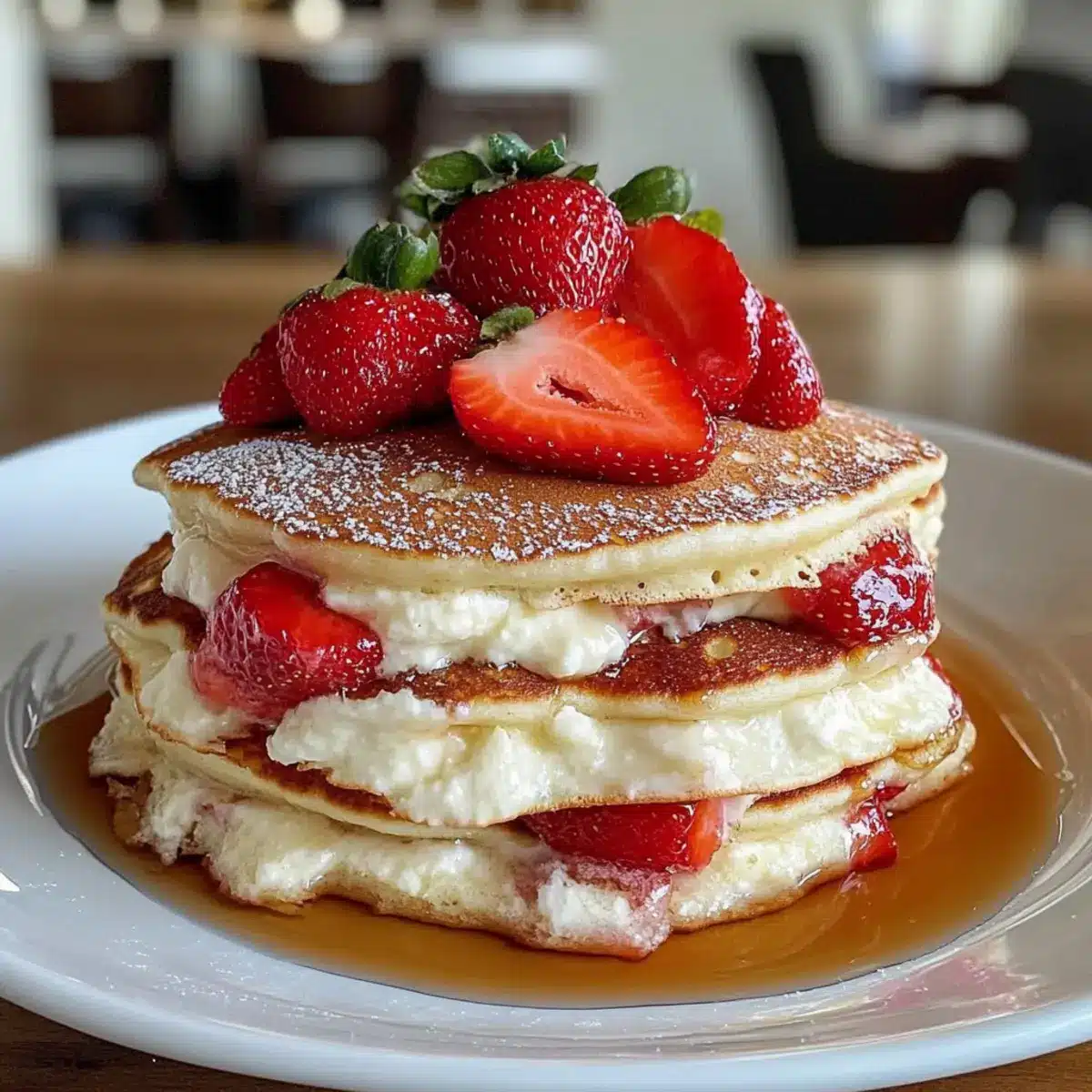 Unwiderstehlicher Geschmack: Die Kombination aus fluffigen Pfannkuchen, cremiger Cheesecake-Füllung und fruchtigen Erdbeeren sorgt für ein Geschmackserlebnis, das einfach begeistert.