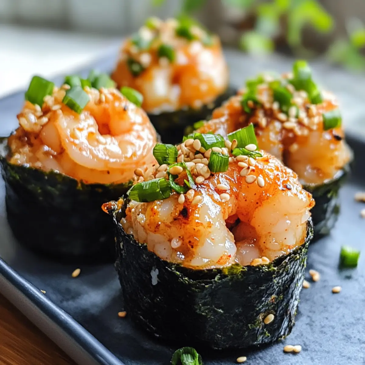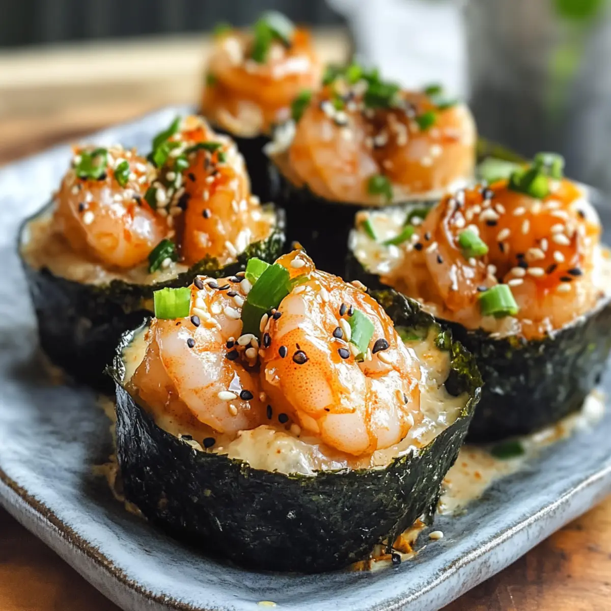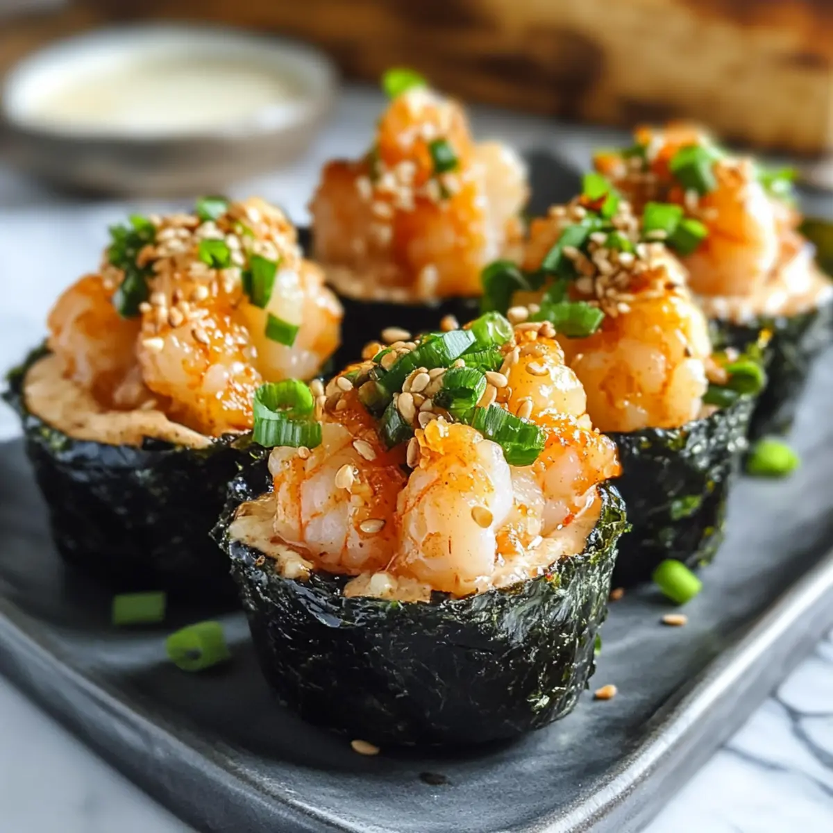 - Tassen zusammensetzen: Legen Sie jeweils einen Esslöffel gekochten Kurzkornreis auf jedes Nori-Stück und fügen Sie einen Esslöffel der Garnelenmischung hinzu.