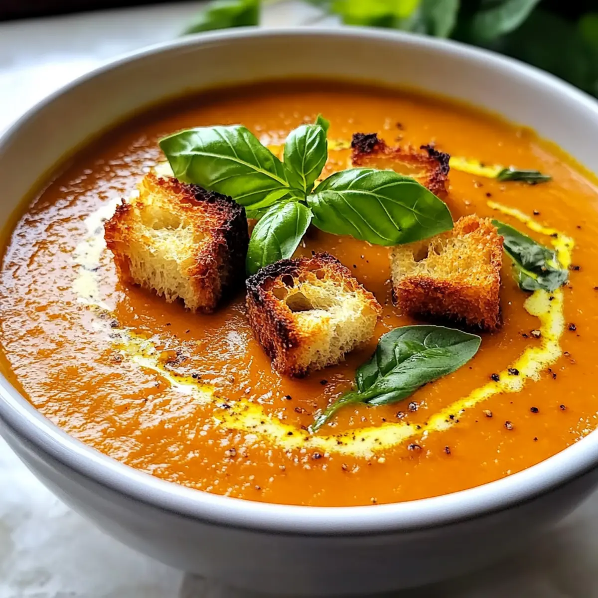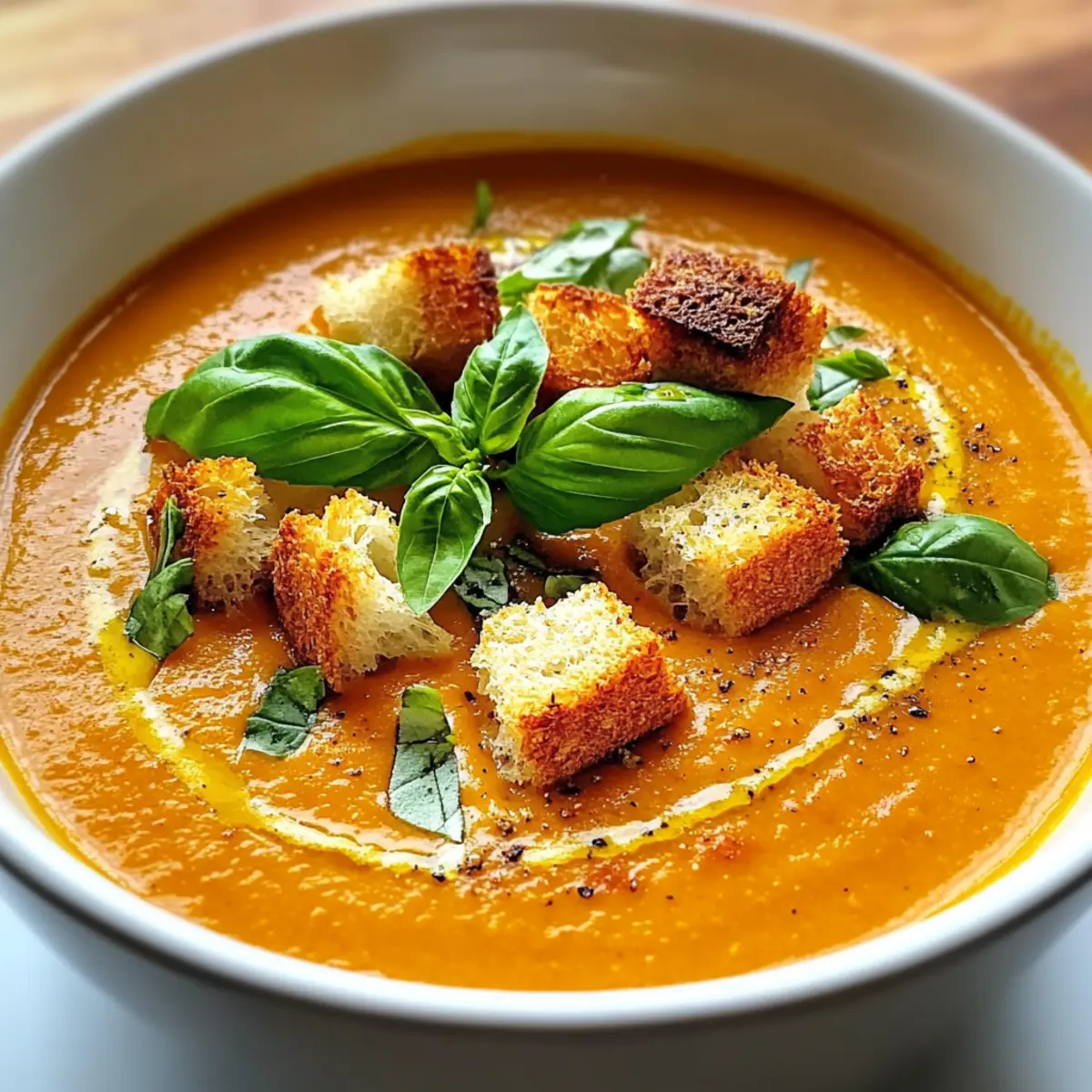 - Serviere die Suppe mit Croutons und frischem Basilikum.