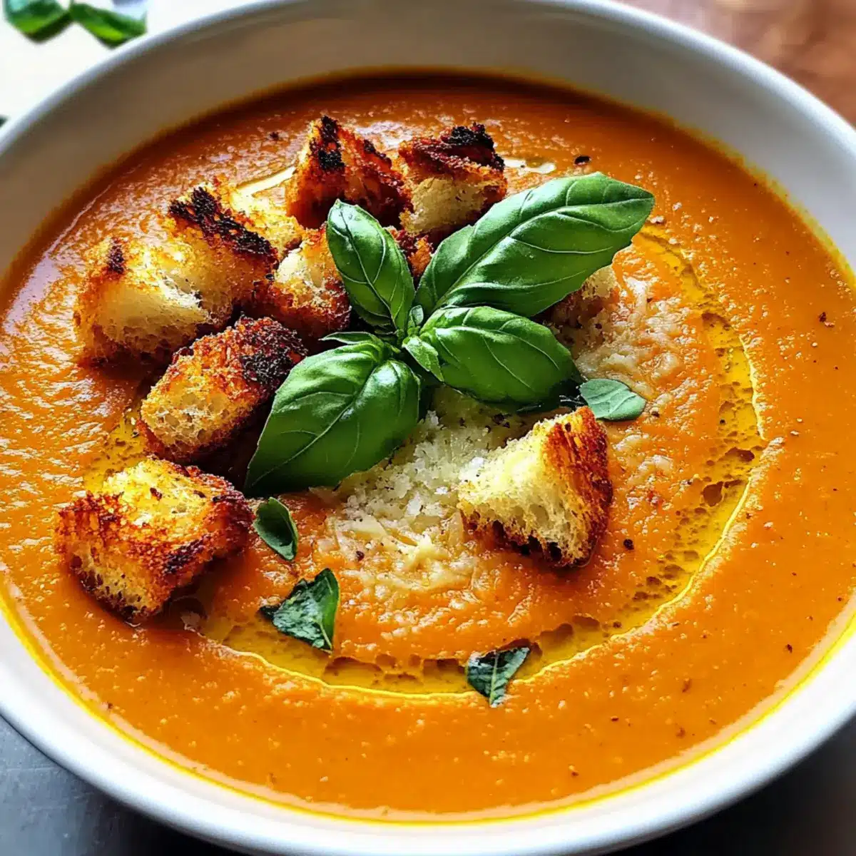 Geröstete Rote Paprika Suppe mit Parmesan Croutons