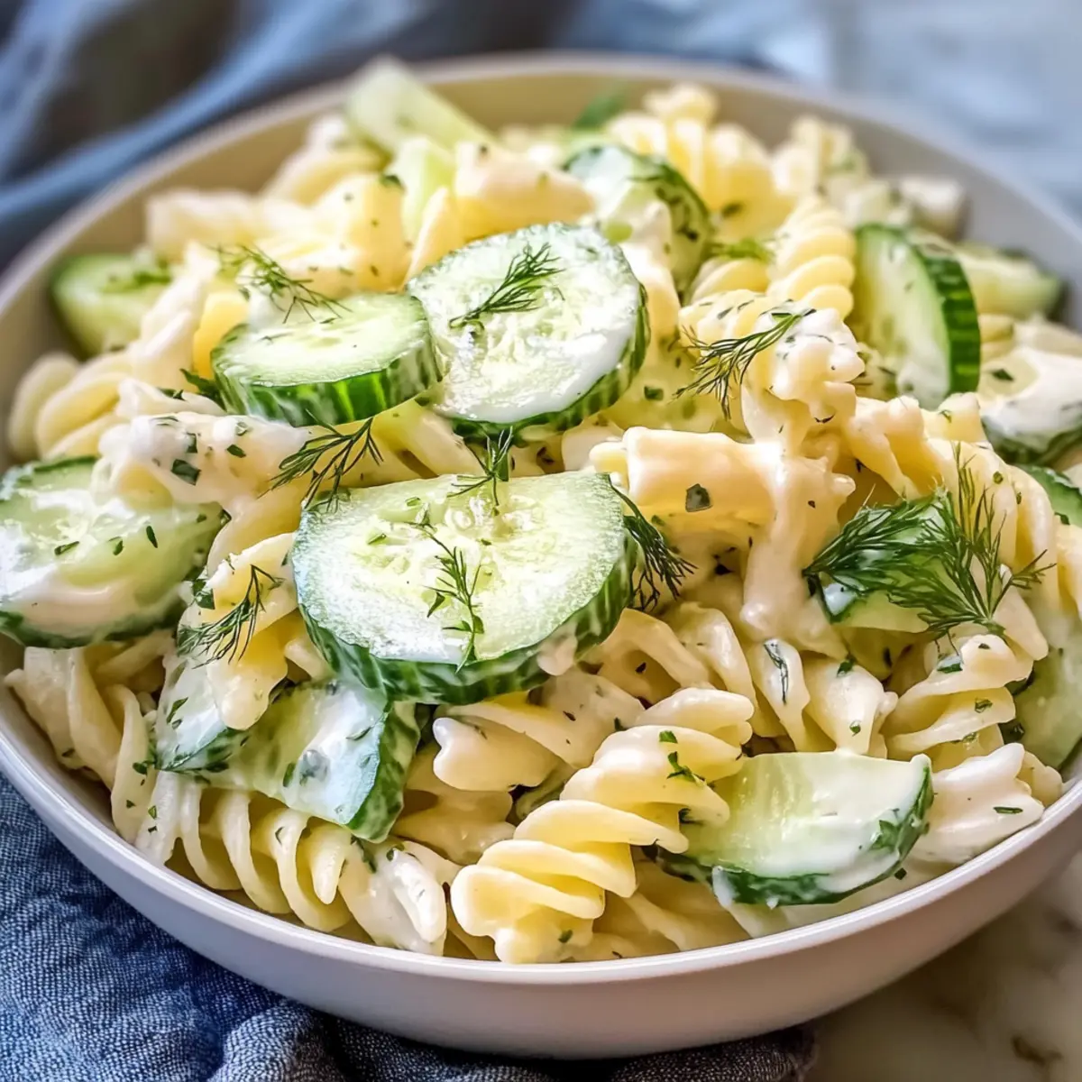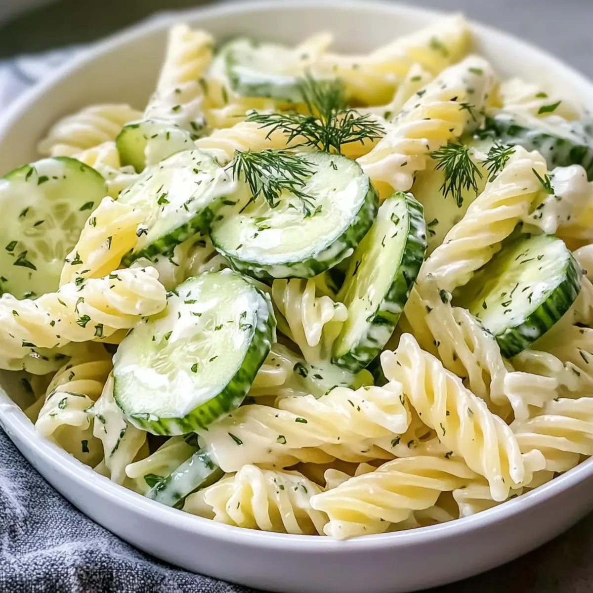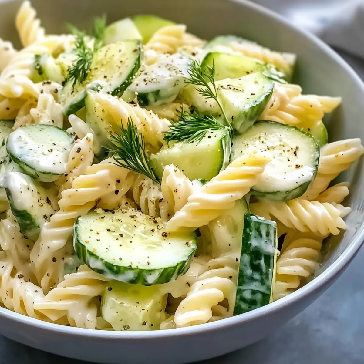 Frische Aromen: Dieser Gesunde Gurken-Nudelsalat vereint knackige Gurken und al dente Pasta, was für einen erfrischenden Biss sorgt.