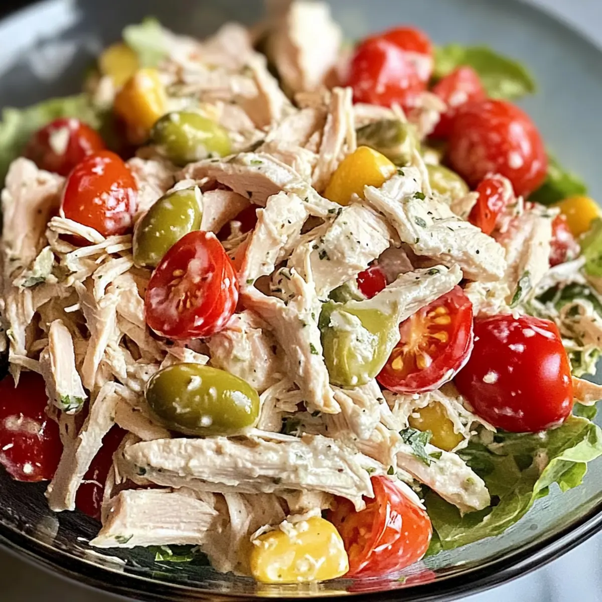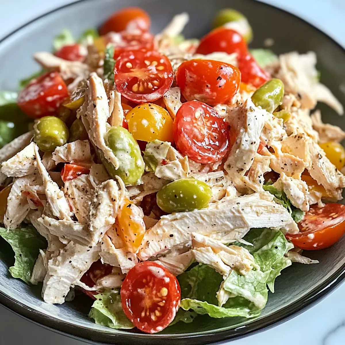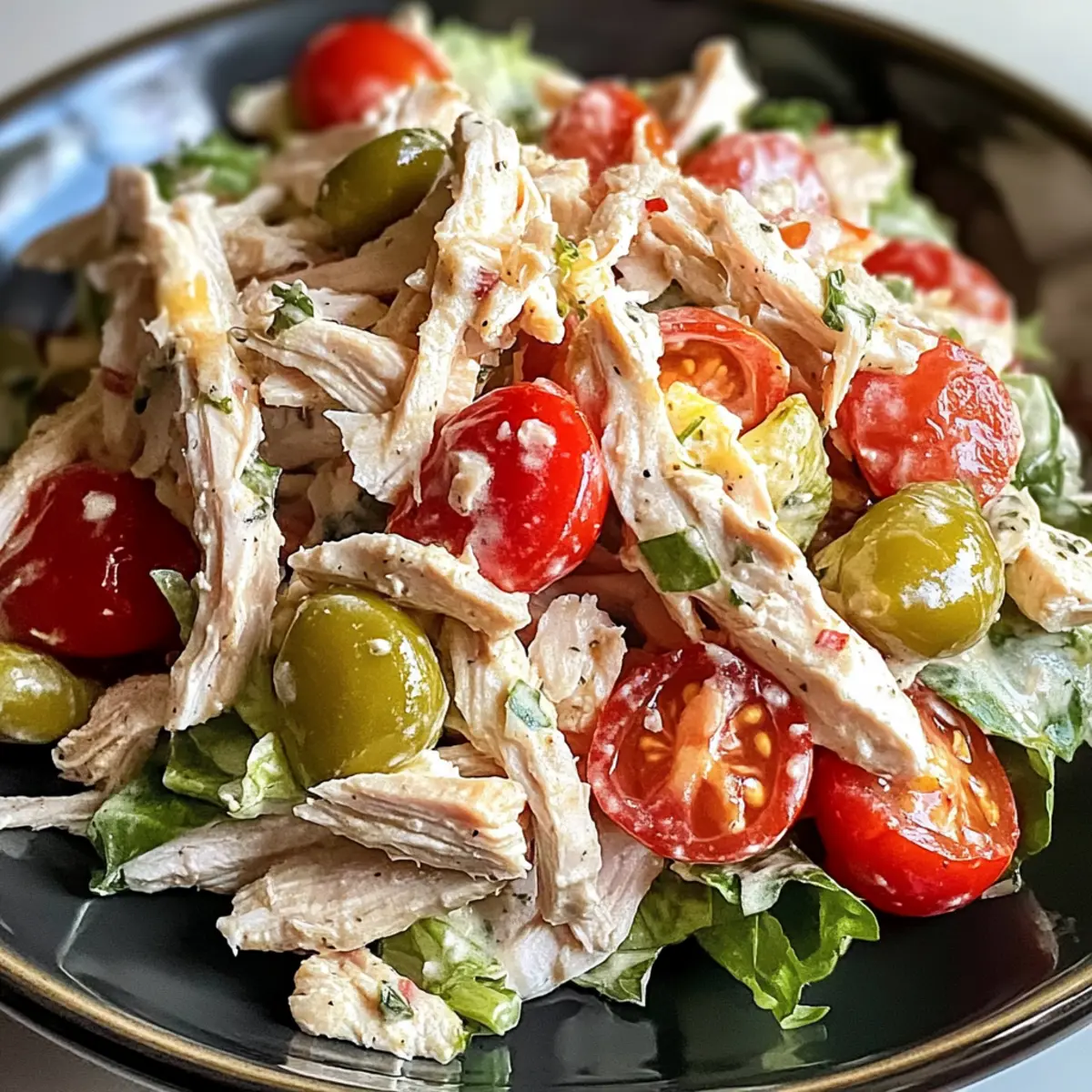 In einer großen Rührschüssel vermengen Sie 2 Tassen zerkleinertes Hähnchen, 6 gehackte Scheiben Aufschnittschinken, 6 gehackte Scheiben Genoa Salami, ½ Tasse in Scheiben geschnittene Pepperoncini, 1 Tasse halbierte Kirschtomaten, 1 Kopf gehackten Römersalat, und ½ Tasse dünn geschnittene rote Zwiebel. Achten Sie darauf, dass die Zutaten gleichmäßig verteilt sind, um das optimale Geschmackserlebnis beim Essen zu gewährleisten.