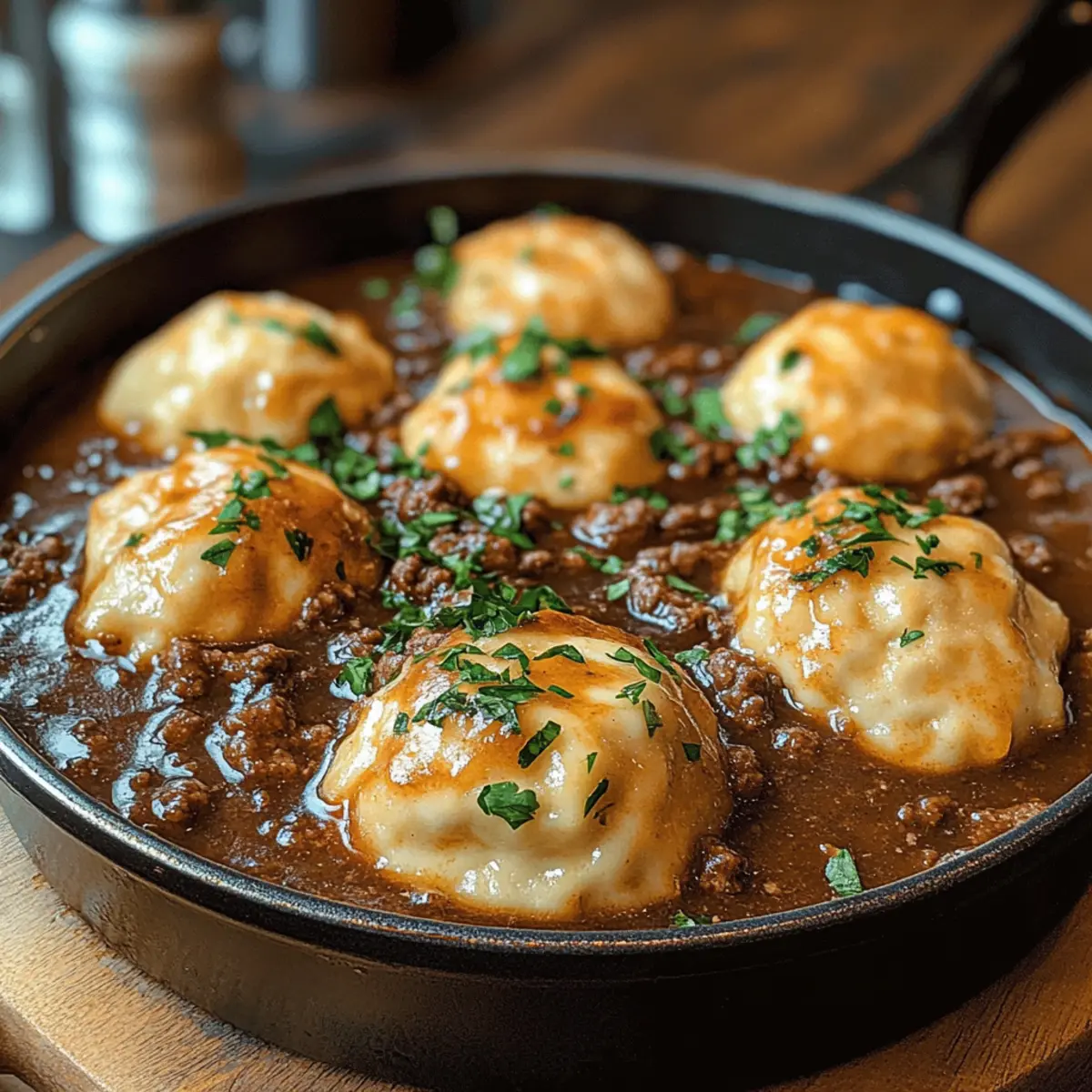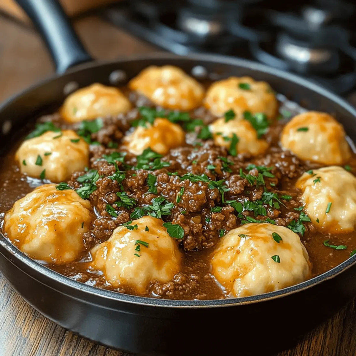 Nachdem die Knödel schön aufgegangen sind, nimm die Pfanne vom Herd und serviere das Gericht sofort. Garniere die Hackfleisch und Knödel mit frischen Kräutern wie Petersilie oder Schnittlauch für zusätzlichen Geschmack und Farbe.