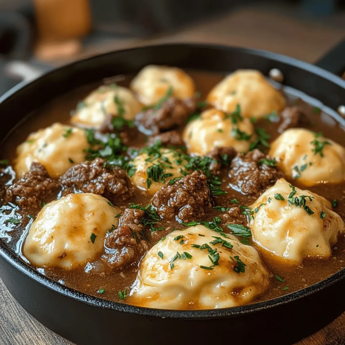 - Nachdem die Knödel schön aufgegangen sind, nimm die Pfanne vom Herd und serviere das Gericht sofort. Garniere die Hackfleisch und Knödel mit frischen Kräutern wie Petersilie oder Schnittlauch für zusätzlichen Geschmack und Farbe.