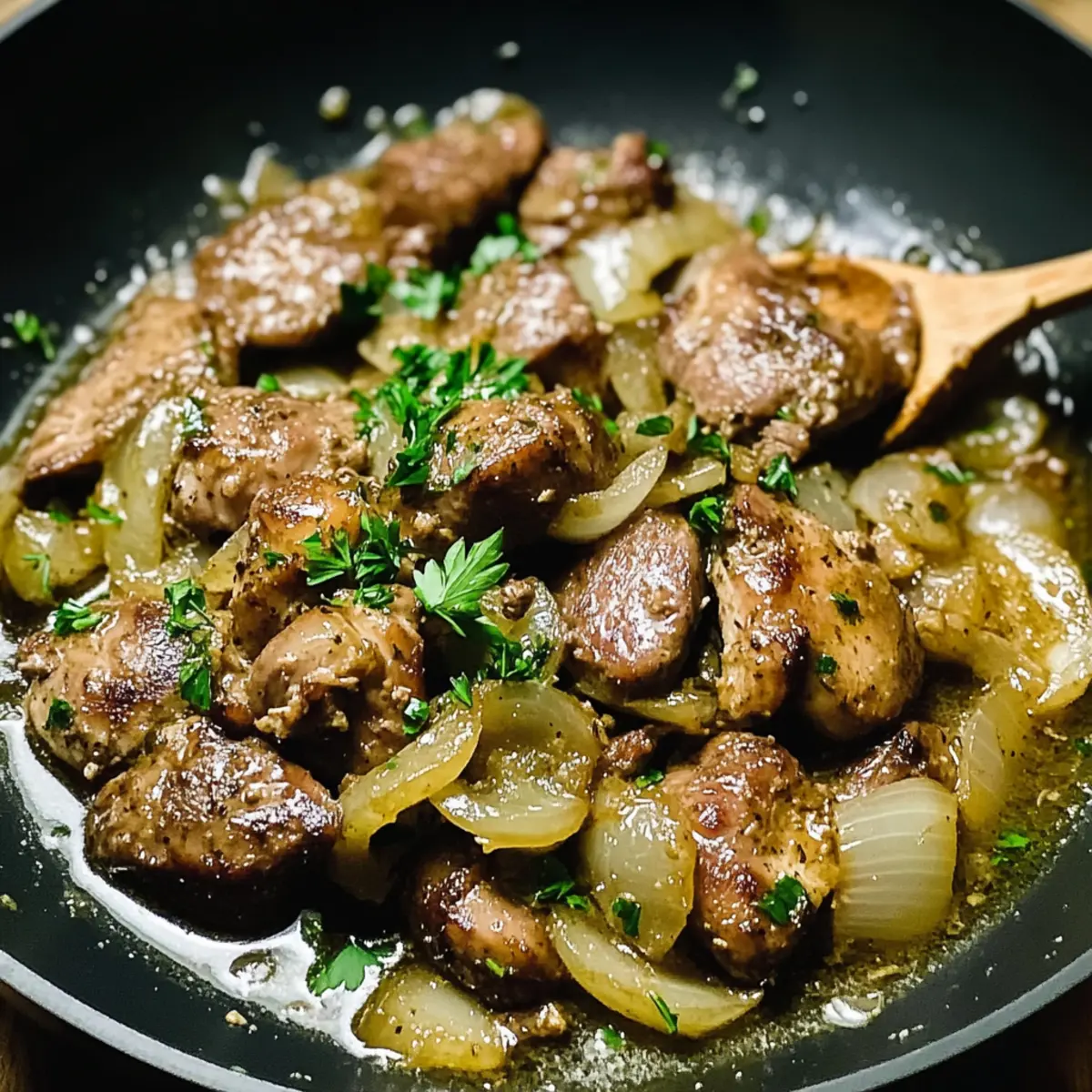 - Schalten Sie die Hitze aus und streuen Sie frische Petersilie über die herzhafte Hühnerleber und Zwiebeln.