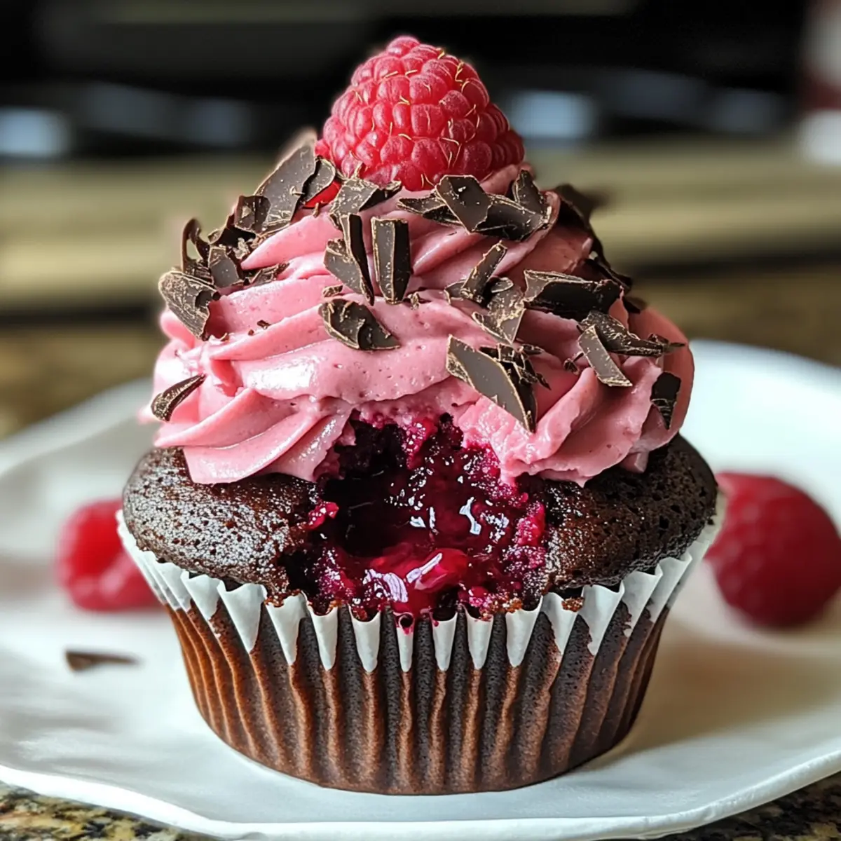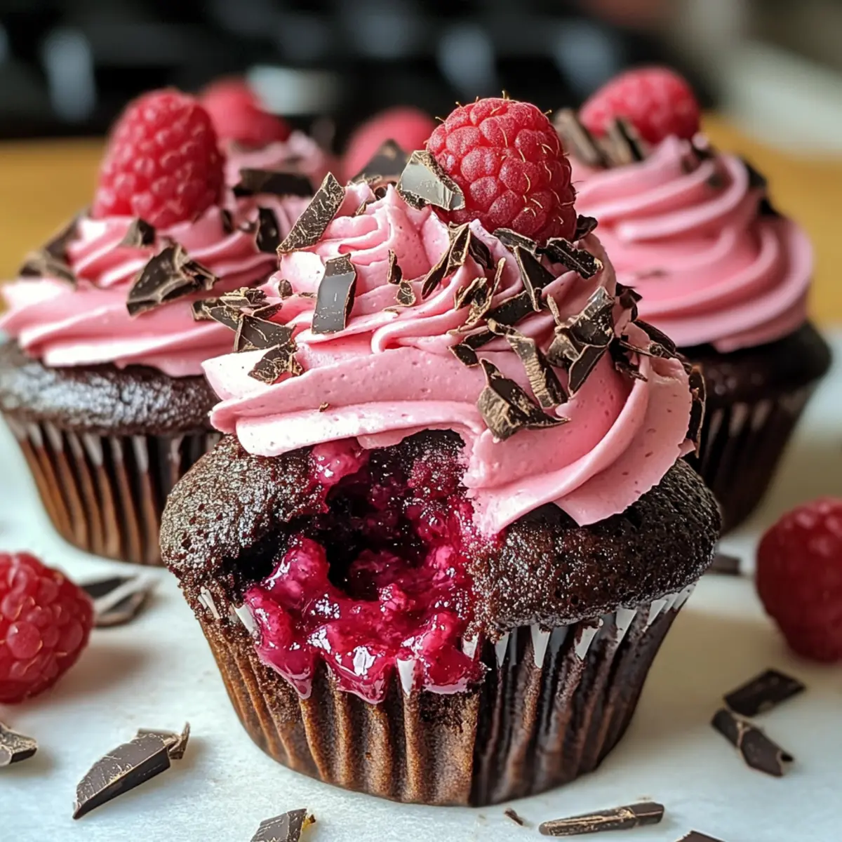 - Frost die abgekühlten Cupcakes mit der Buttercreme und garniere sie mit Himbeeren und Schokoladenspänen.