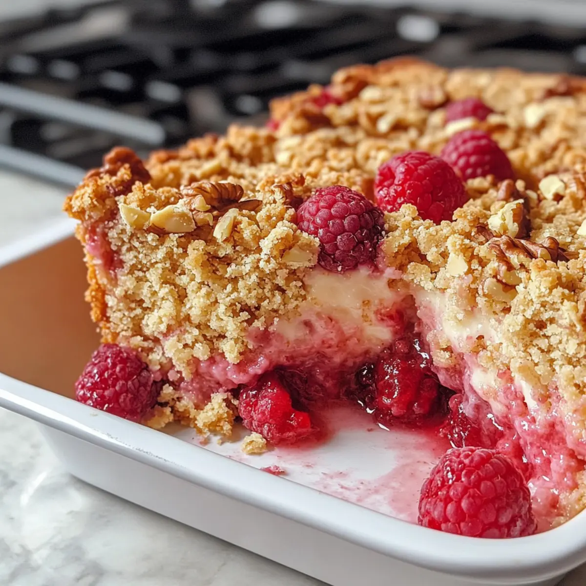 Serviervorschläge: Servieren Sie den Himbeercrumble warm mit einer Kugel Vanilleeis oder einem Klecks Schlagsahne, um die Aromen zu ergänzen.
