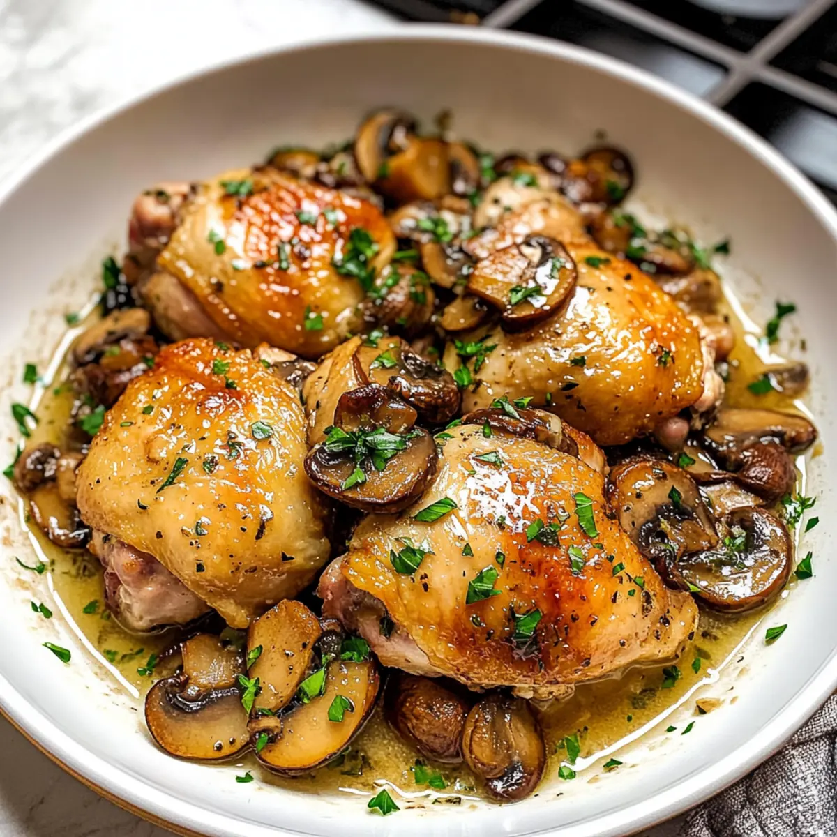 Frische Kräuter benutzen: Verwende frische Kräuter anstelle von getrockneten, um das Aroma deiner Knoblauch Pilz Hähnchenschenkel zu intensivieren. Zwei Teelöffel frischer Thymian oder Rosmarin sind optimal.