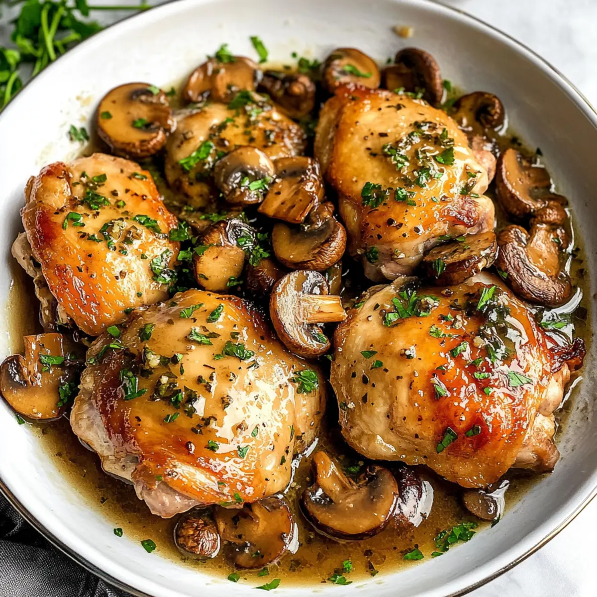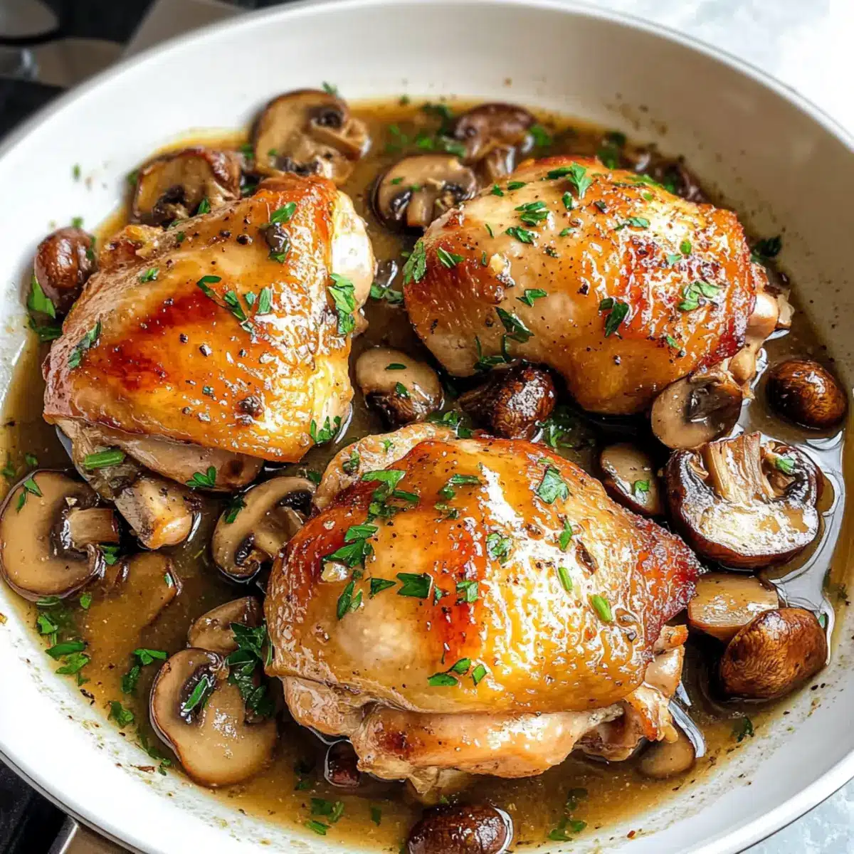 Die Knoblauch Pilz Hähnchenschenkel auf Tellern anrichten und großzügig mit der Pilzsauce übergießen. Mit frischer Petersilie garnieren für einen Hauch von Frische. Die Hähnchenschenkel sind nun fertig und bereit, serviert zu werden!