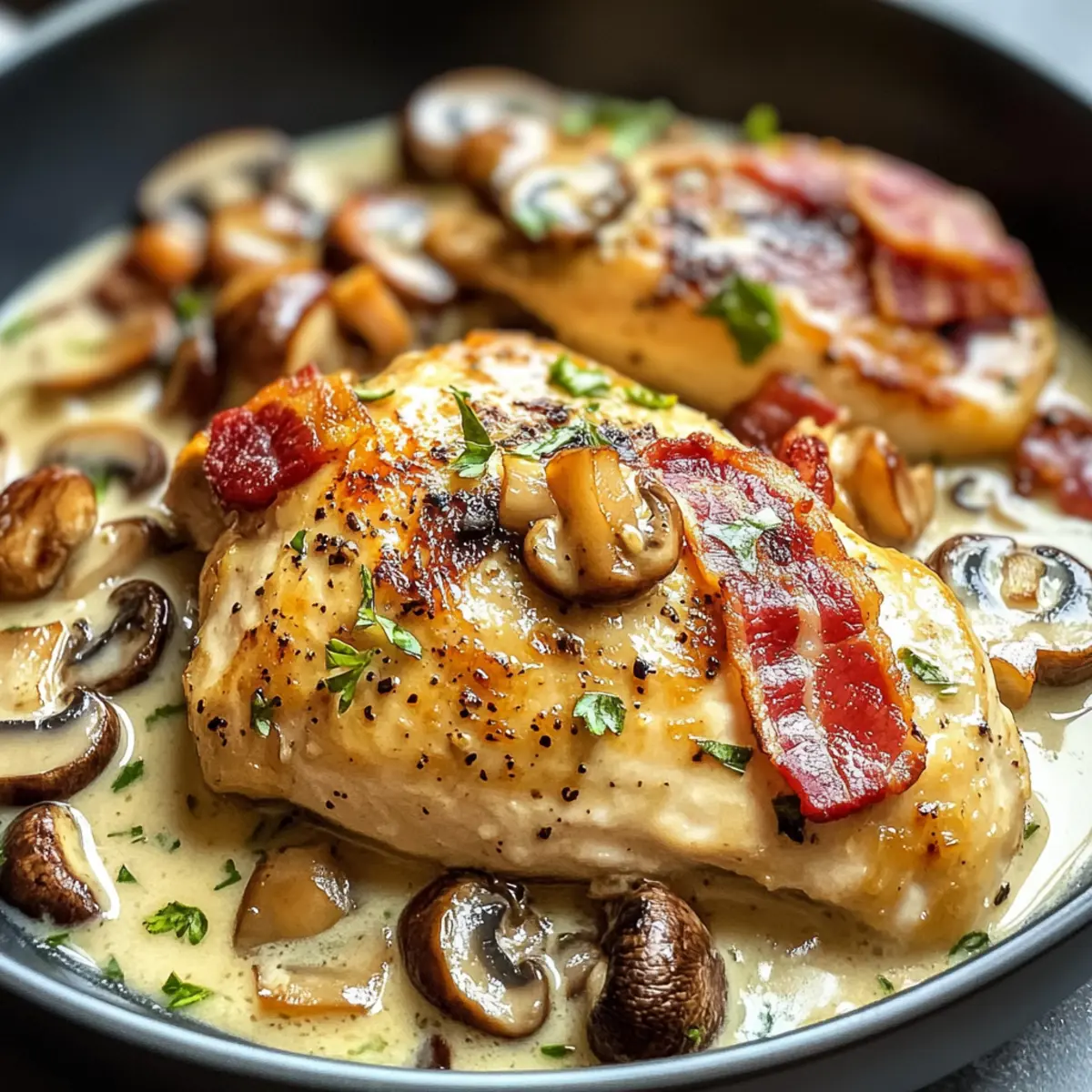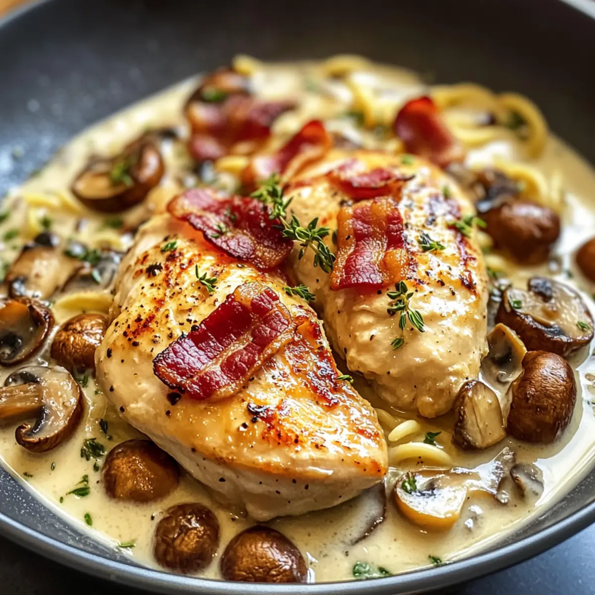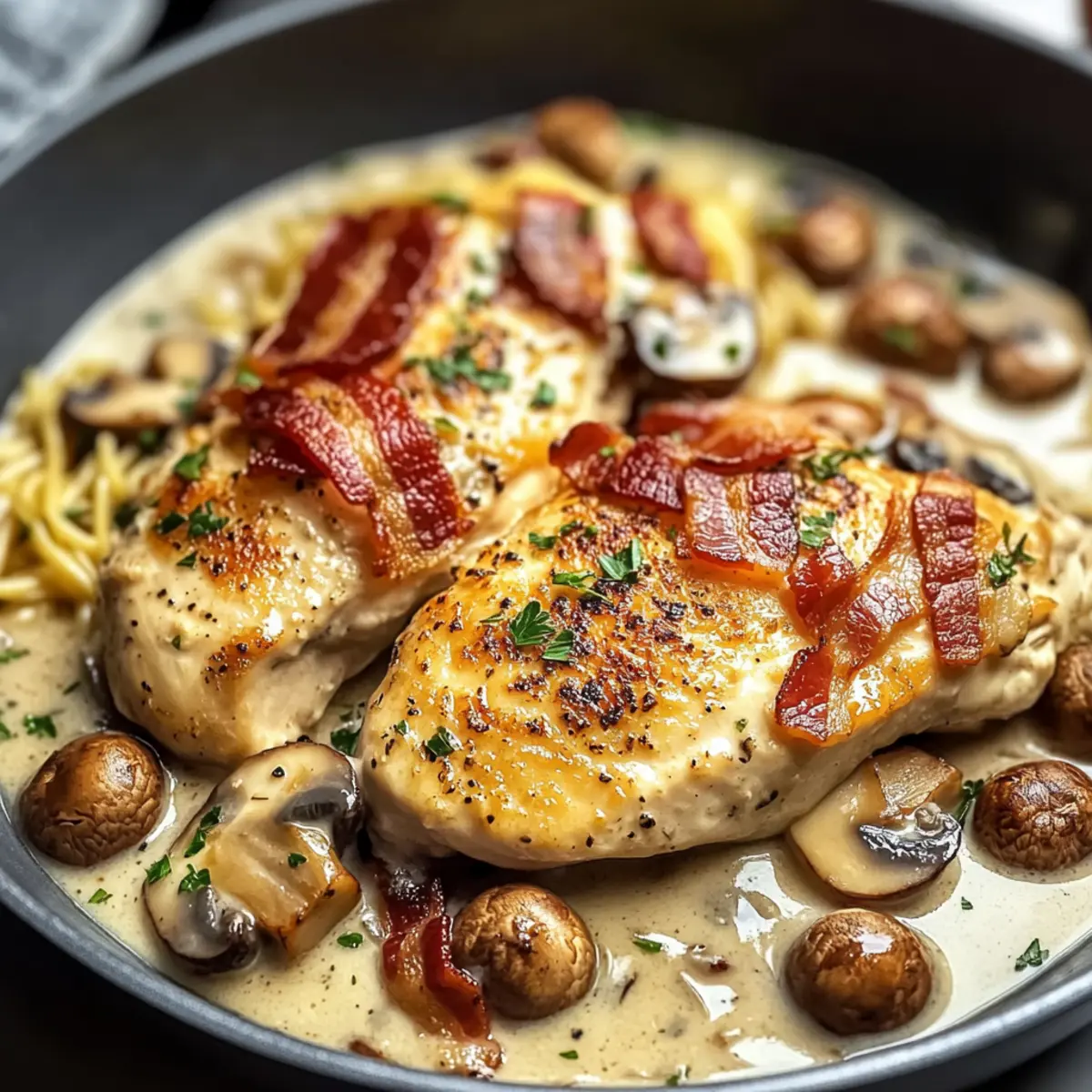 Perfekte Textur: Die cremige Sauce harmoniert wunderbar mit der knusprigen Bacon-Kruste und dem zarten Hühnchen, was zu einem unvergesslichen Esserlebnis führt.
