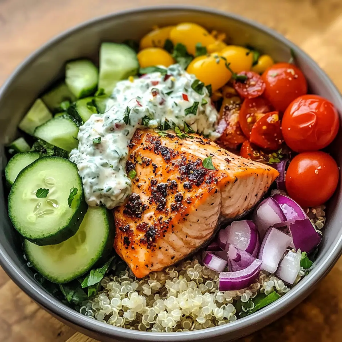 Frische Zutaten: Bereite die Tzatziki-Sauce und den frischen Salat erst kurz vor dem Servieren zu, um das beste Geschmackserlebnis der Mediterraner Lachs Bowl zu gewährleisten.