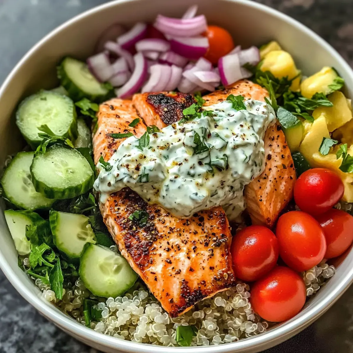 - Serviere die Mediterraner Lachs Bowl, indem du Blattsalat, Quinoa, Salatmix, gebackenen Lachs und Tzatziki hinzufügst.
