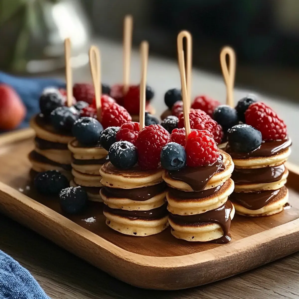 Unwiderstehlich, diese Mini-Pfannkuchen-Spieße sind der Hit auf jeder Feier! Flauschig und lecker, sie verbinden den reichen Geschmack von Nuss-Nougat-Creme mit der Frische von Beeren. Einfach zuzubereiten, du benötigst nur wenige gängige Zutaten, um diese Leckerbissen zu kreieren. Vielseitig nutzbar, sie eignen sich perfekt für Brunch, Partys oder als süßer Snack für die Kinder. Optisch ansprechend, die bunten Spieße sind ein echter Hingucker und laden alle zum Genießen ein. Probiere auch andere Toppings wie Marmelade oder Joghurt für noch mehr Varianten!