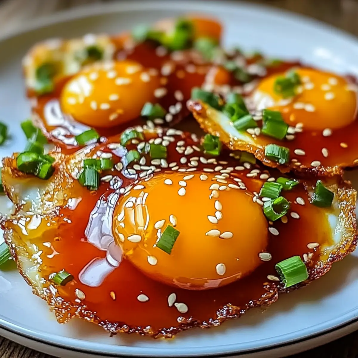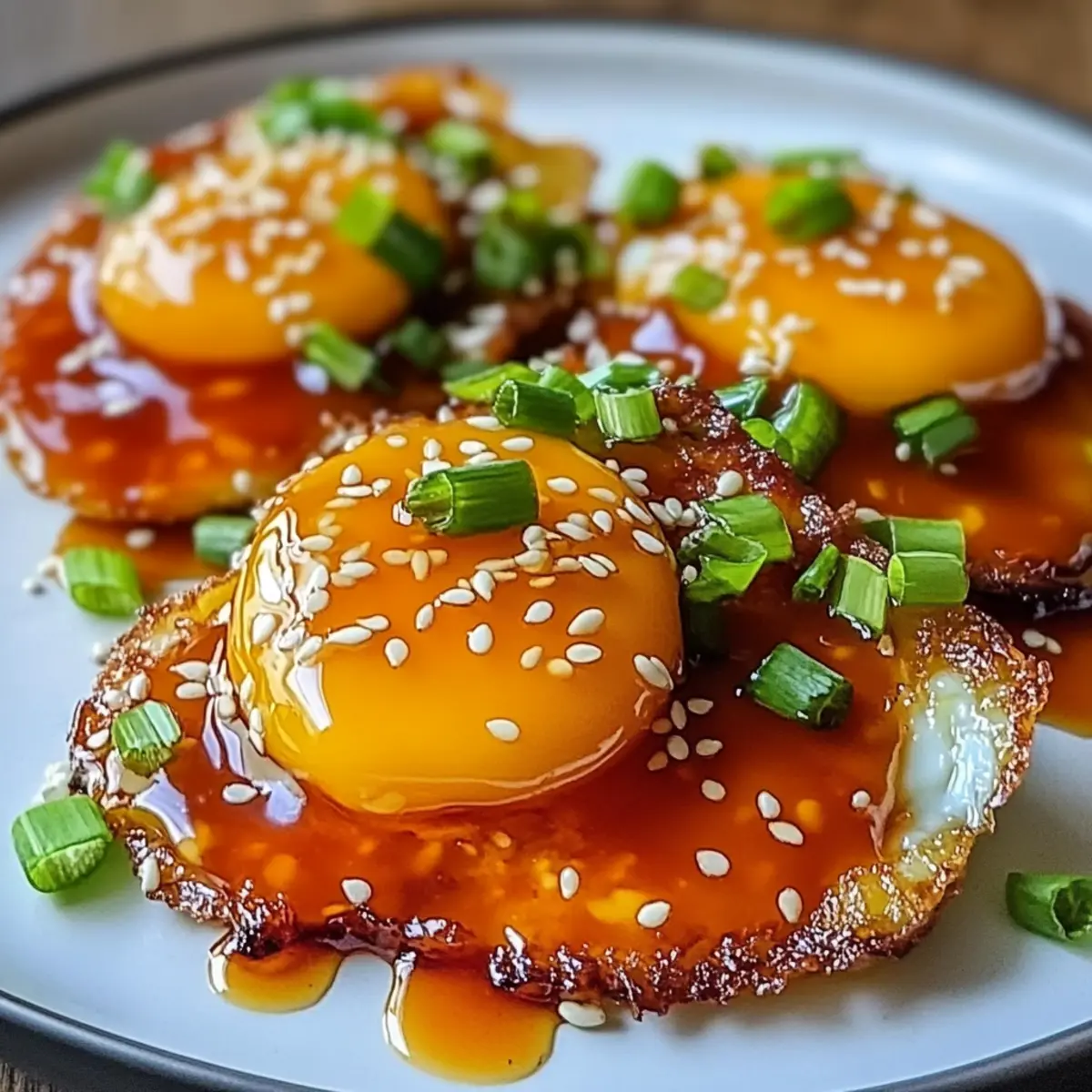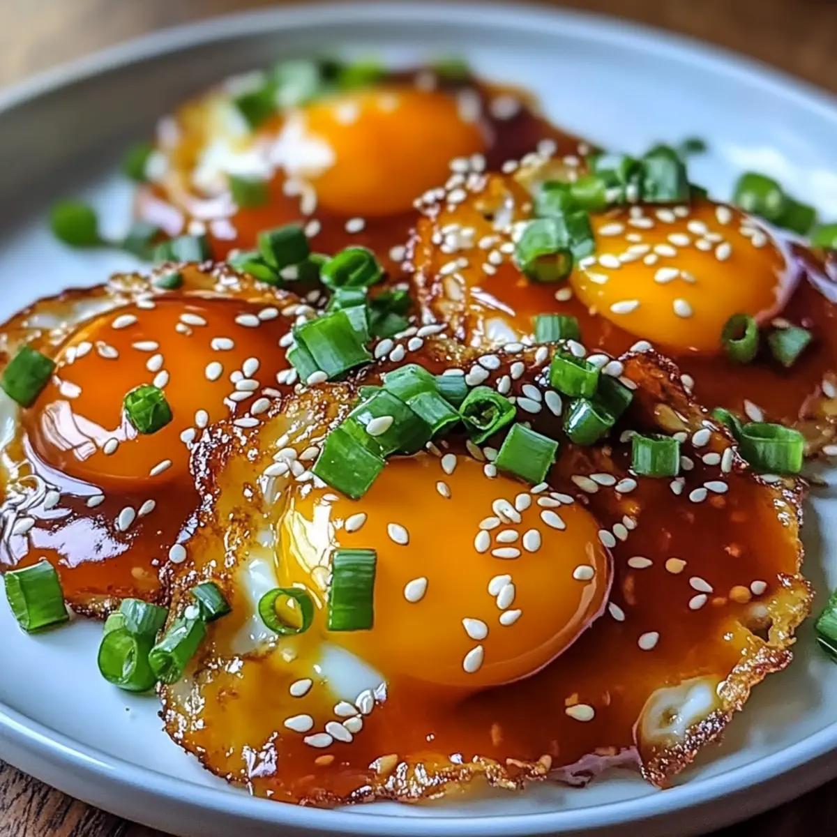 - Bestreue die Eier mit gehackten Frühlingszwiebeln und Sesamkörnern und serviere sie heiß.