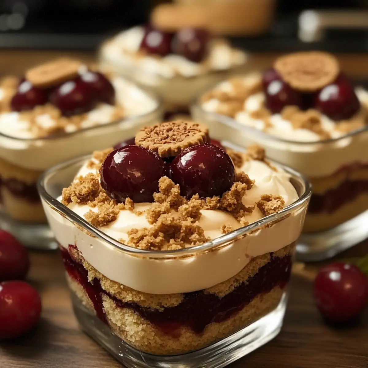 - In Dessertgläser jeweils einen Löffel der Mascarpone-Creme, gefolgt von Kirschen und zerbröselten Spekulatius-Keksen schichten.