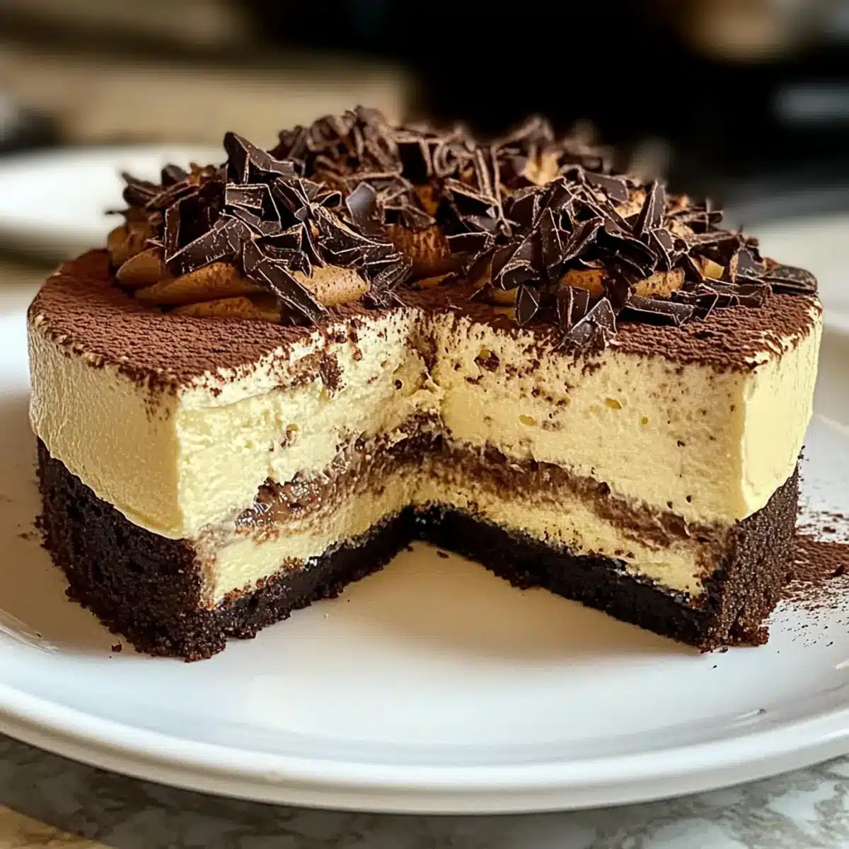Wunderbare Texturen: Das Zusammenspiel von fester Käsekuchenschicht und luftiger Schokoladensahne bietet ein einmaliges Geschmackserlebnis, das zum Verweilen einlädt.