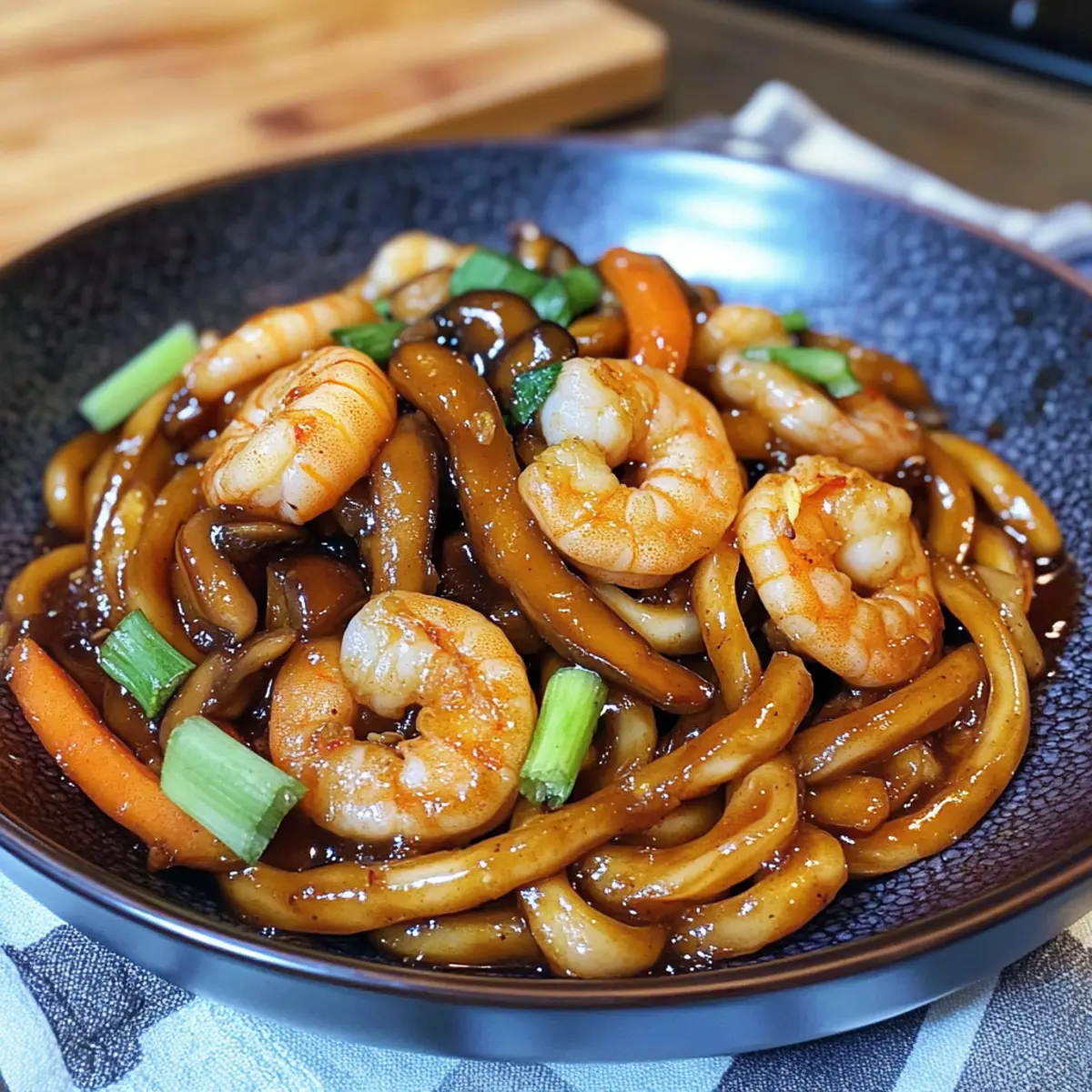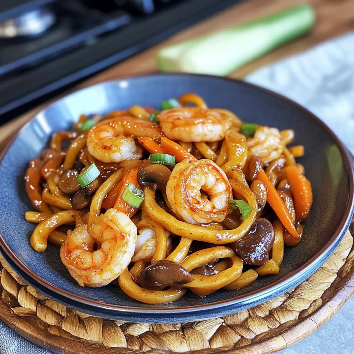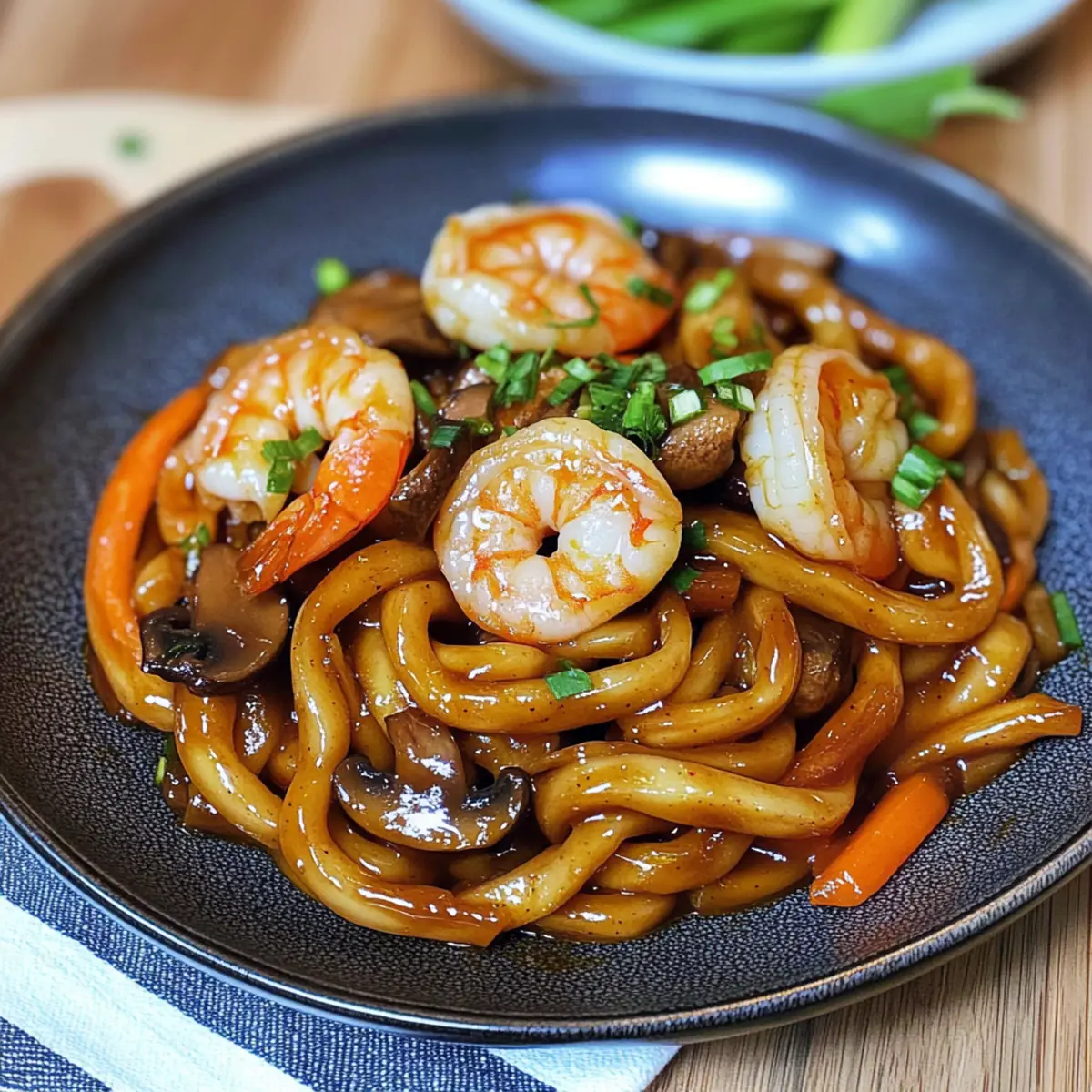 Aromenexplosion: Die Kombination aus zarten Garnelen, Udon-Nudeln und frischem Gemüse sorgt für ein Geschmackserlebnis, das sofort zufriedenstellt.