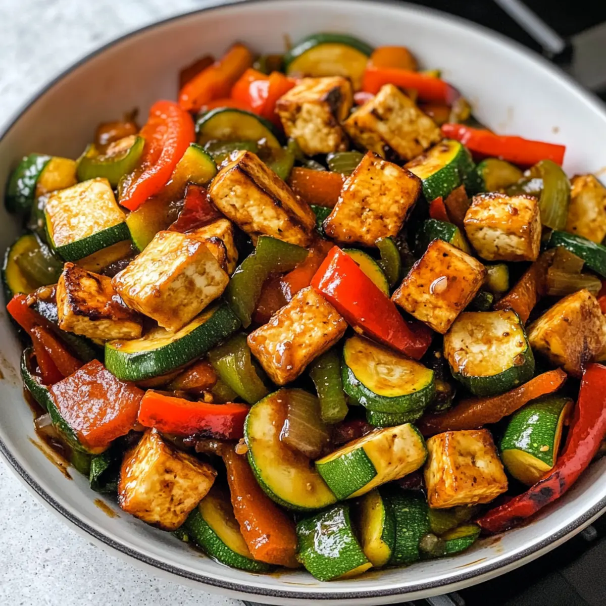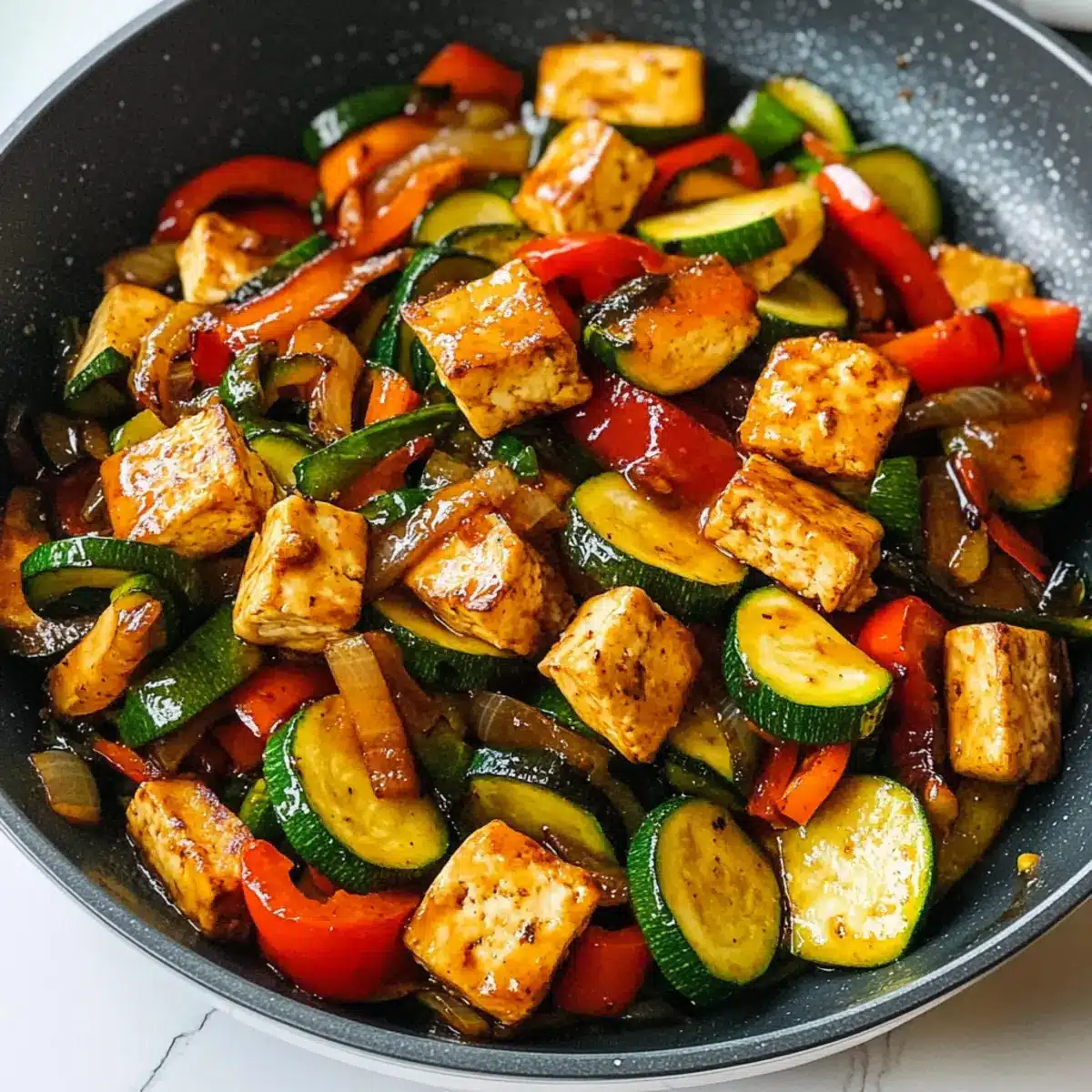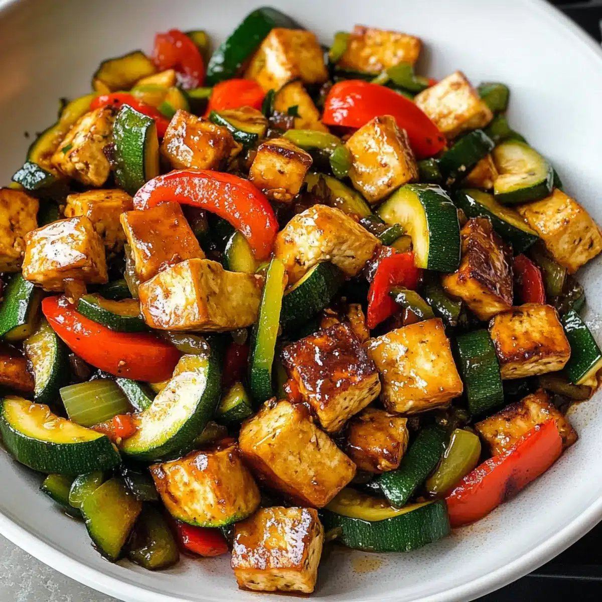 Jeder Biss dieser Zucchini Pfanne mit Tofu ist ein Fest für die Sinne – lass dich von den Aromen verzaubern!